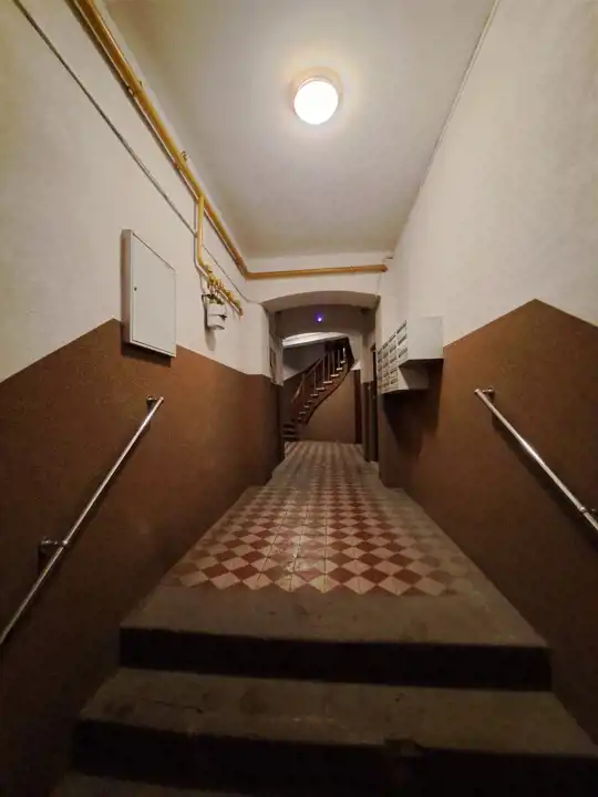 Kamienica w dobrym stanie technicznym z nowym dachem, klatka schodowa zadbana i zabezpieczona domofonem.