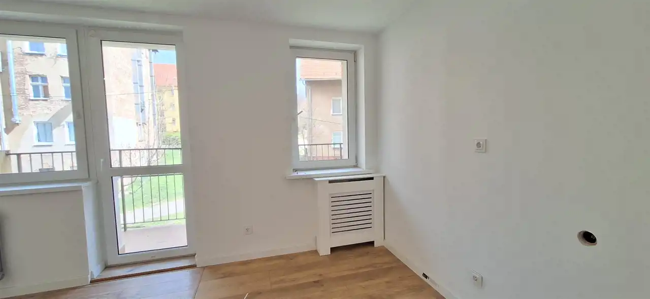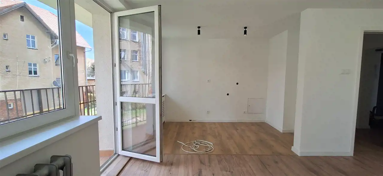 Z salonu wyjście na duży balkon i widok na zabudowę wielorodzinną. Kuchnia połączona z otwartą kuchnią wkrótce zamontowane meble kuchenne.