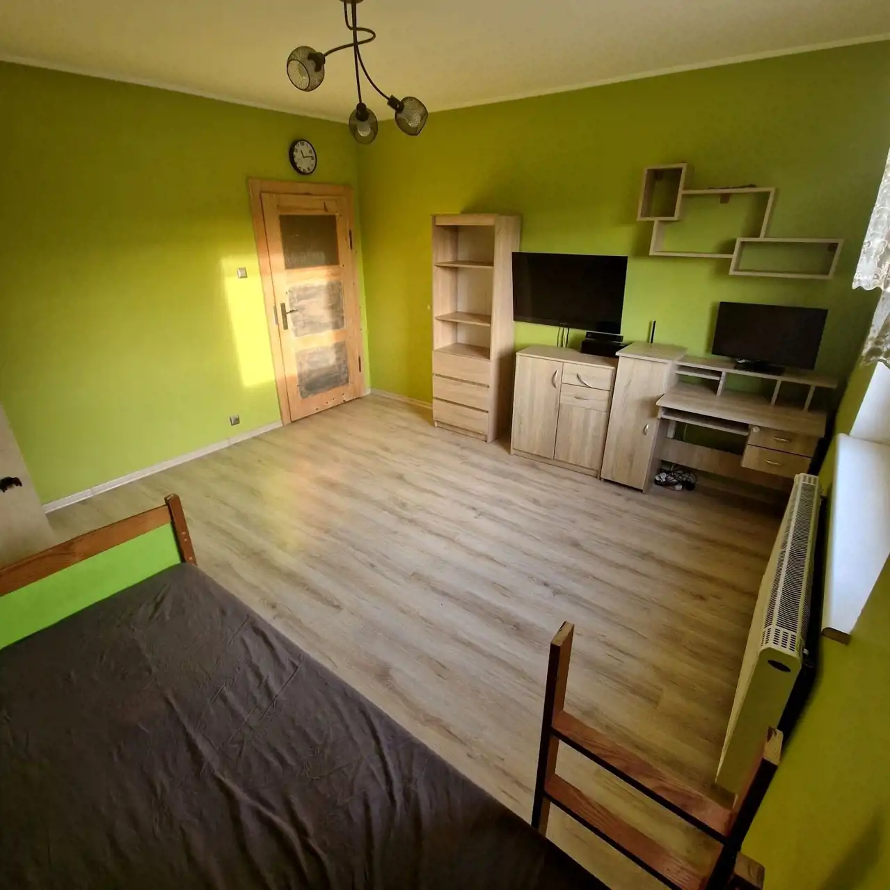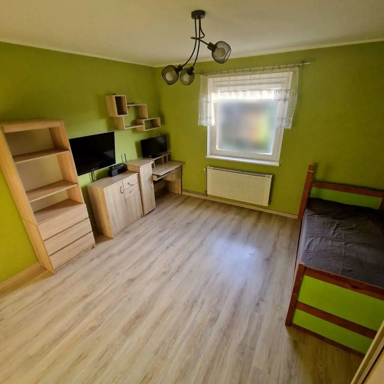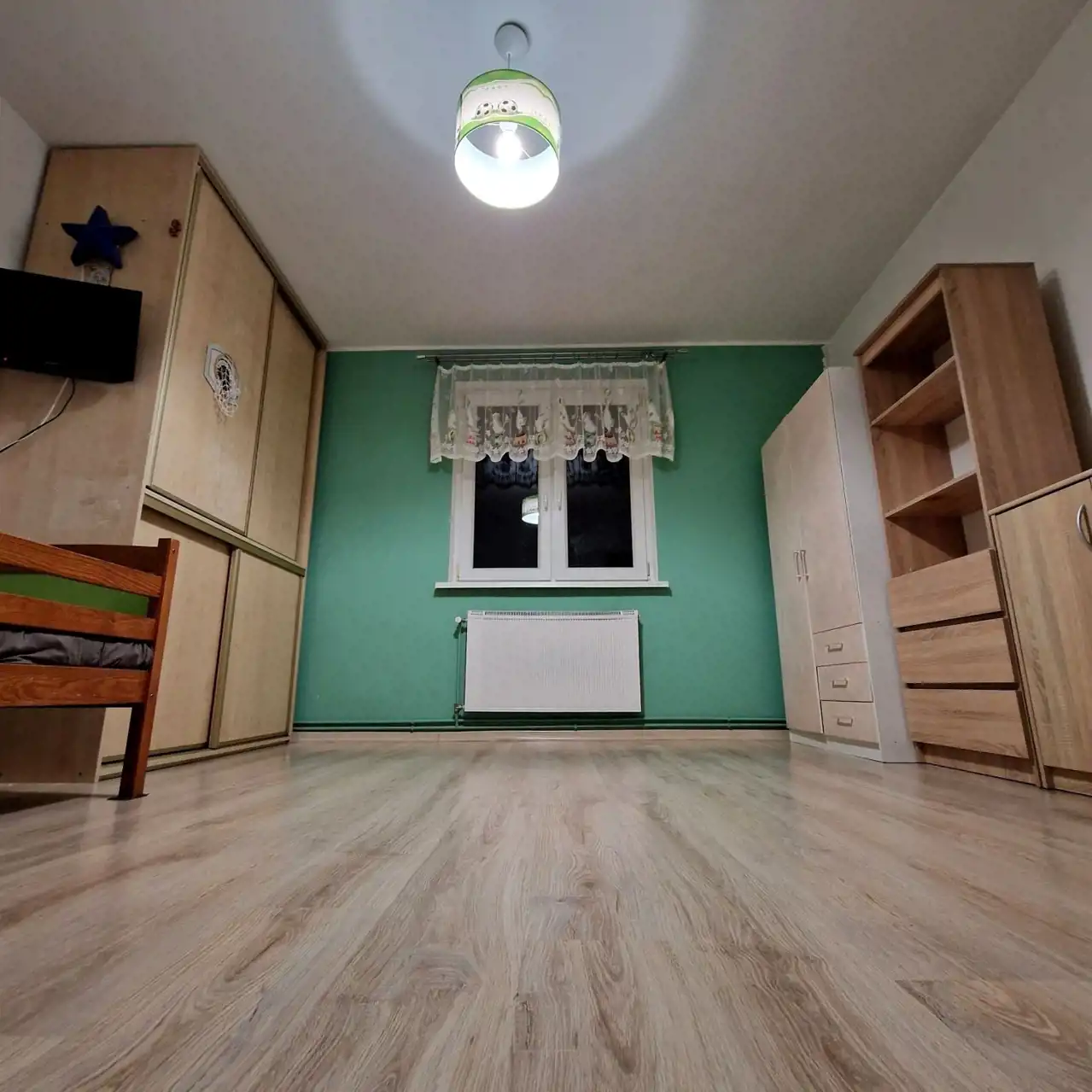 Pokoje są bardzo ustawne, posiadają okna plastikowe, odremontowane drzwi drewniane. Na podłogach panele, kafle, oraz parkiet drewniany.