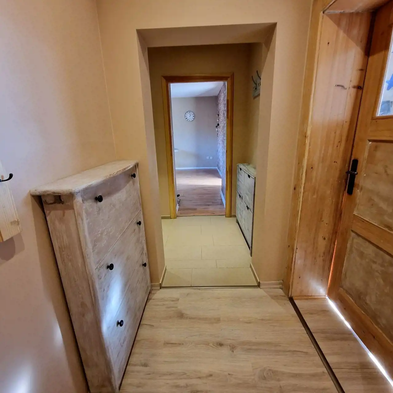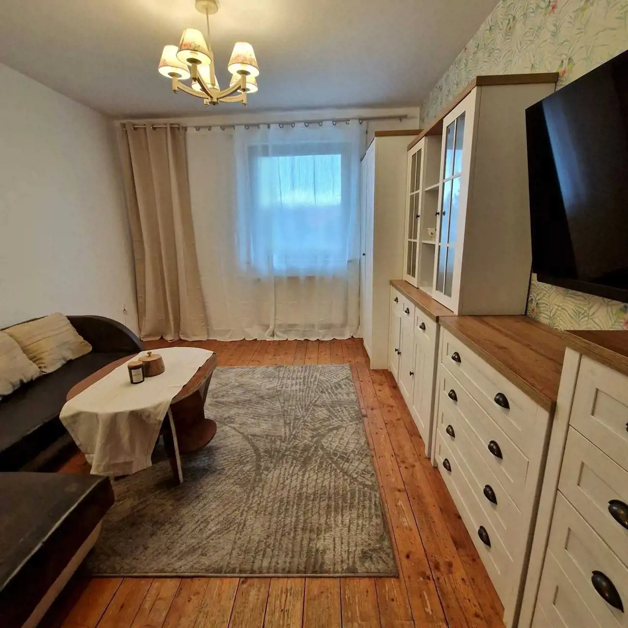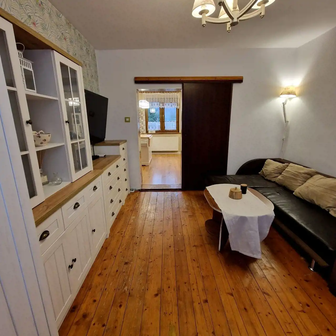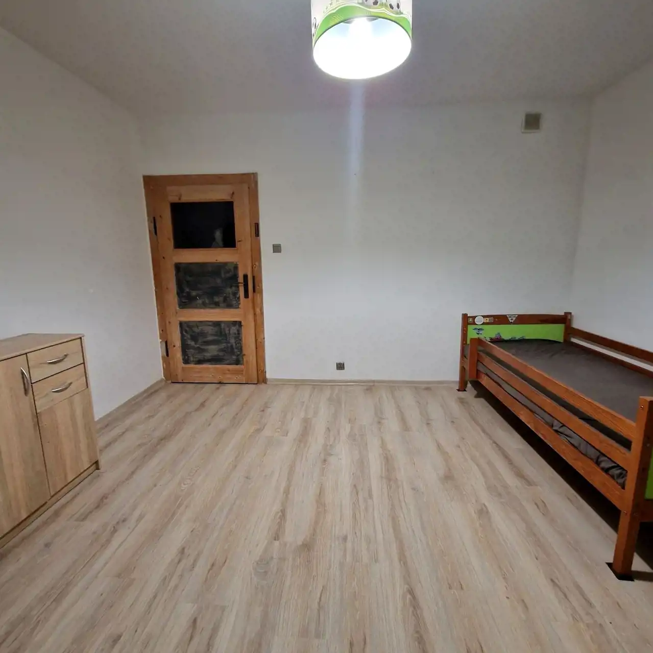 Pokoje są bardzo ustawne, posiadają okna plastikowe, odremontowane drzwi drewniane. Na podłogach panele, kafle, oraz parkiet drewniany.
