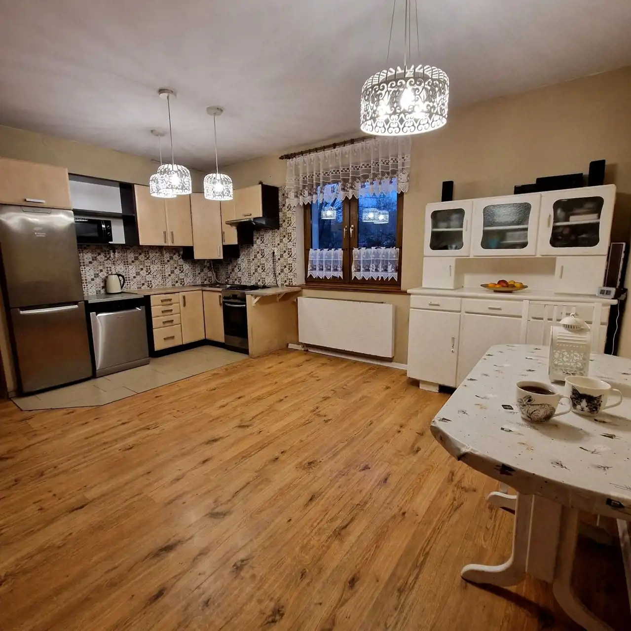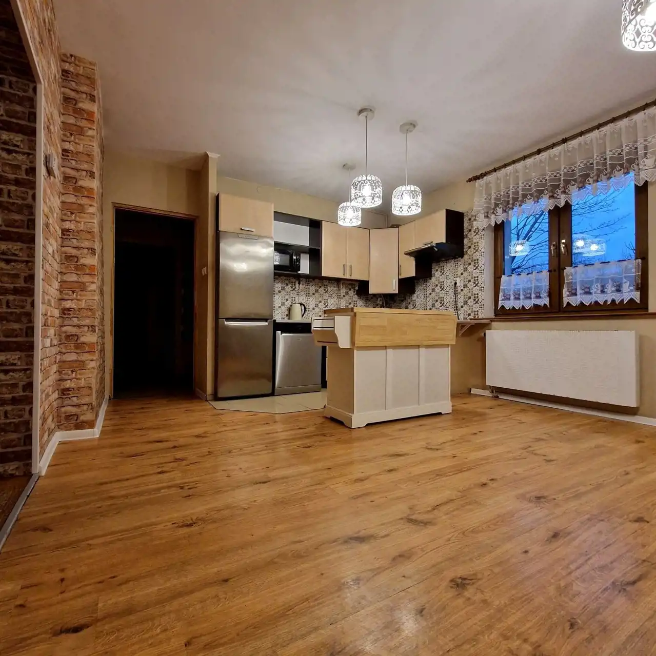 Bardzo duża kuchnia wykorzystywana z jadalnią. Kuchnie jest przechodnja. Prowadzi do salonu, więc istnieje możliwość zrobienia loftu. Meble i podłogi można wymienić.