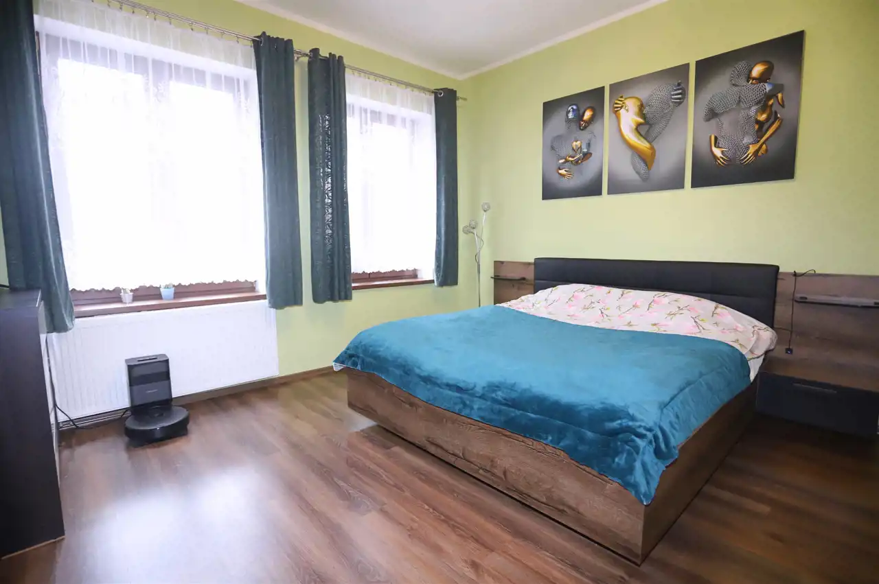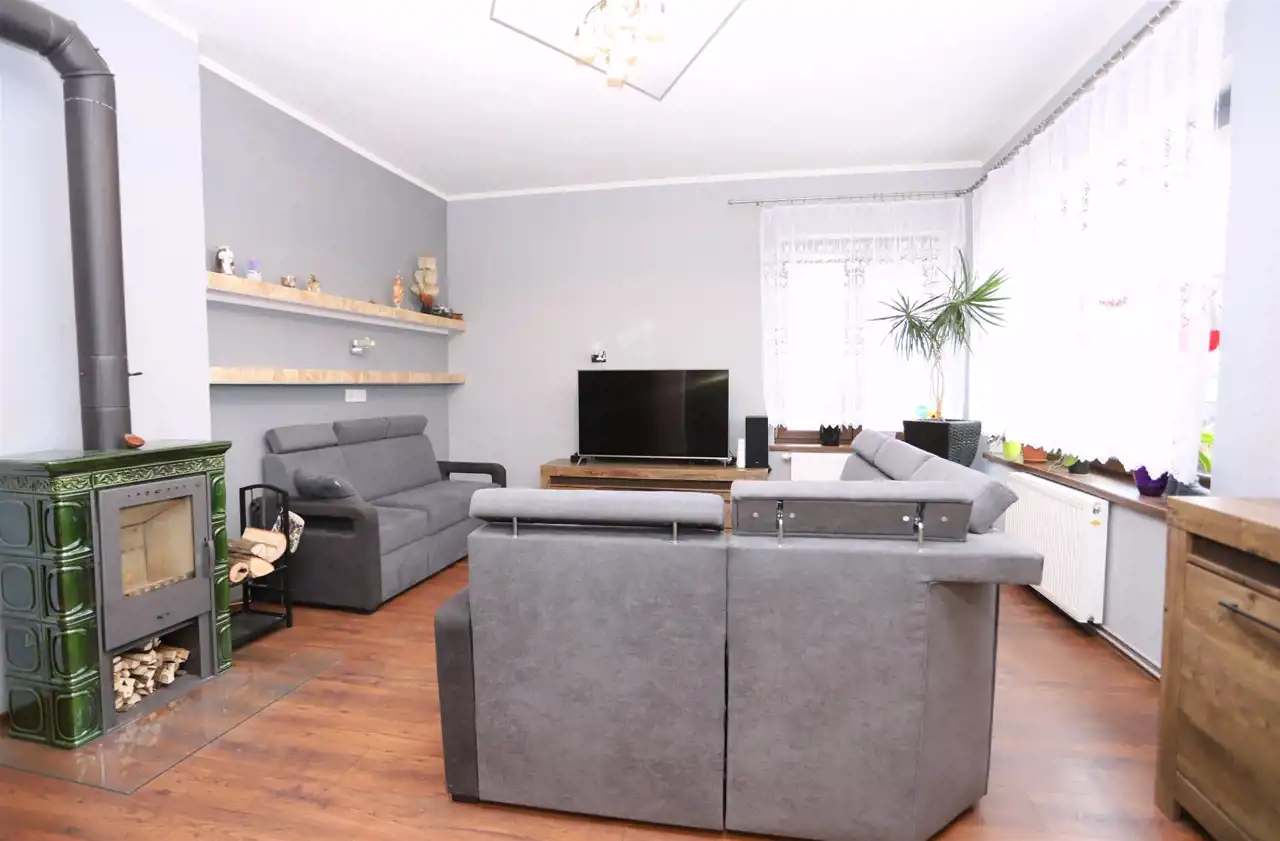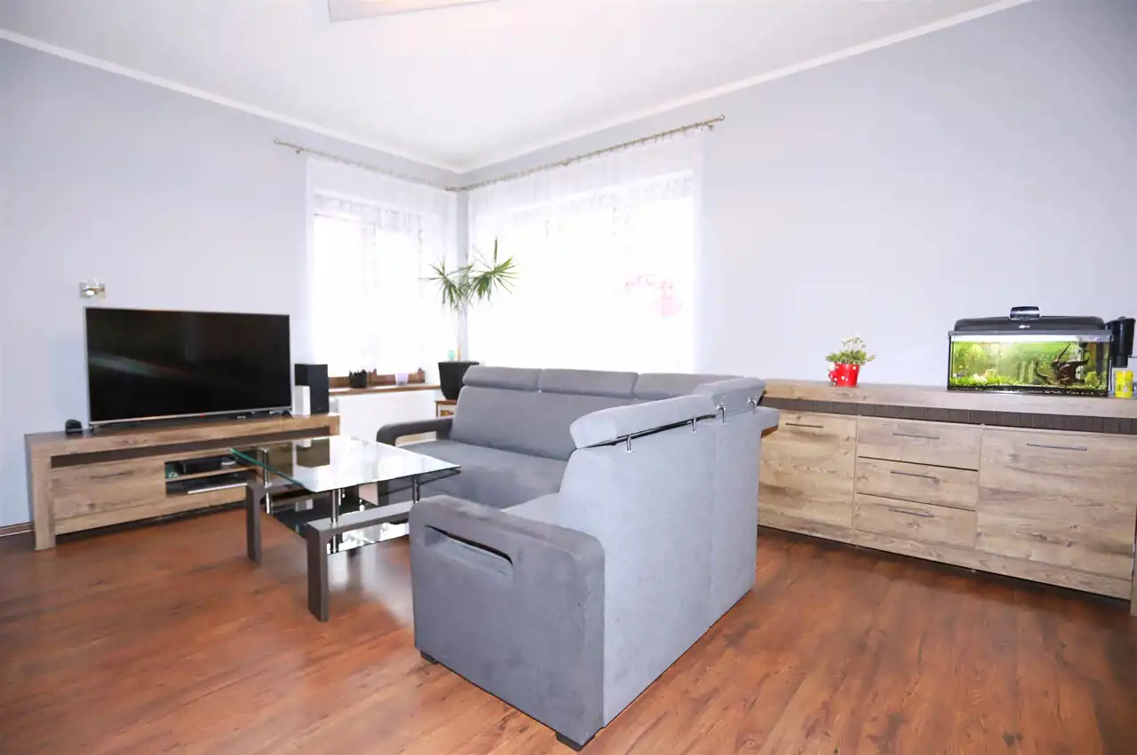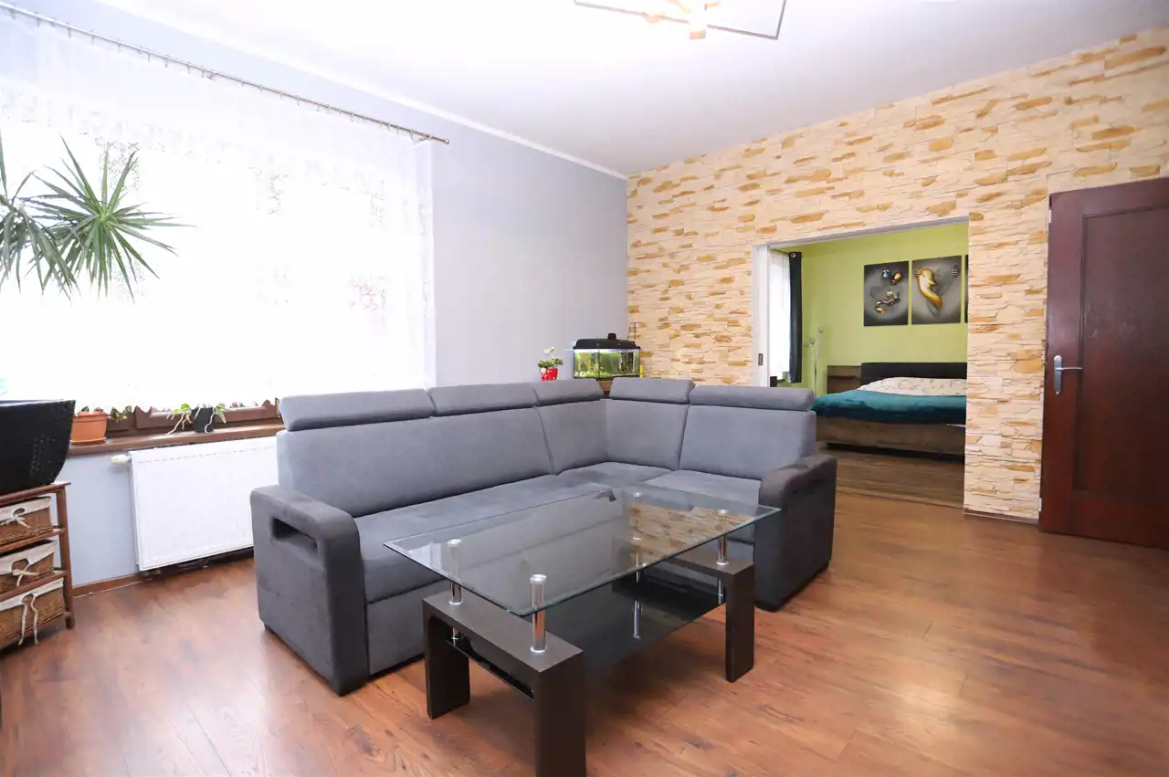 W skład tej interesującej nieruchomości o powierzchni 87,1 m² wchodzi słoneczny, ustawny salon, dwie niezależne sypialnie (z możliwością podziału jednej z nich na dwa odrębne pomieszczenia), jasna kuchnia ze spiżarką, łazienka z toaletą oraz przedpokój zapewniający dostęp do każdego z pokoi. Mieszkanie ogrzewane jest komfortowym ogrzewaniem gazowym, a dodatkowy klimat i realne oszczędności zapewnia kominek w salonie. Do lokalu przynależą dwie piwnice o powierzchni 2 m² i 6 m². Obecni właściciele korzystają również z pobliskiego ogrodu, którego użytkowanie można przejąć. W sąsiedztwie znajduje się garaż — opcjonalnie dostępny do zakupu za 55 000 zł.