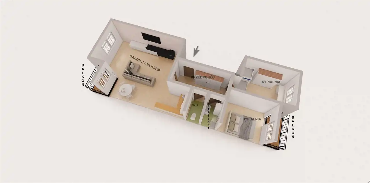 - Charakterystyka mieszkania 60.5 m2, 3 pokoje