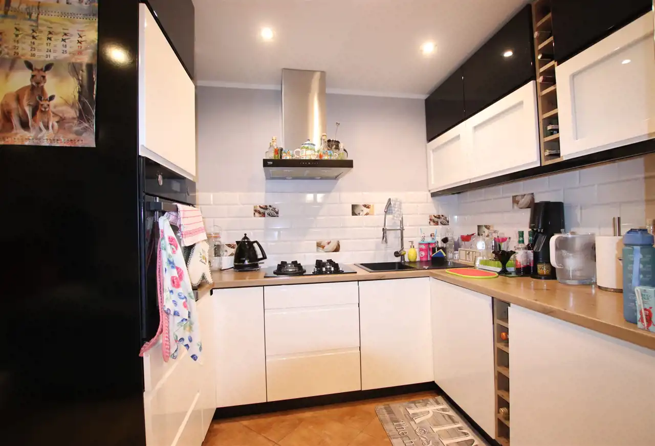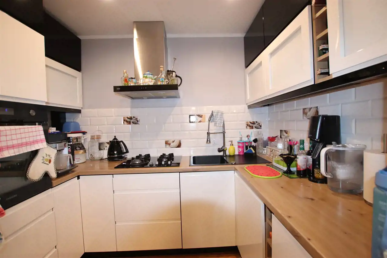 Kuchnia wyposażona jest w meble w zabudowie oraz sprzęt AGD.