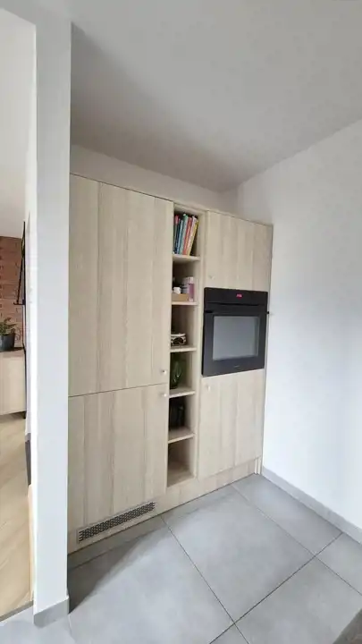 * otwarta, jasna kuchnia w zabudowie wraz ze sprzętem AGD