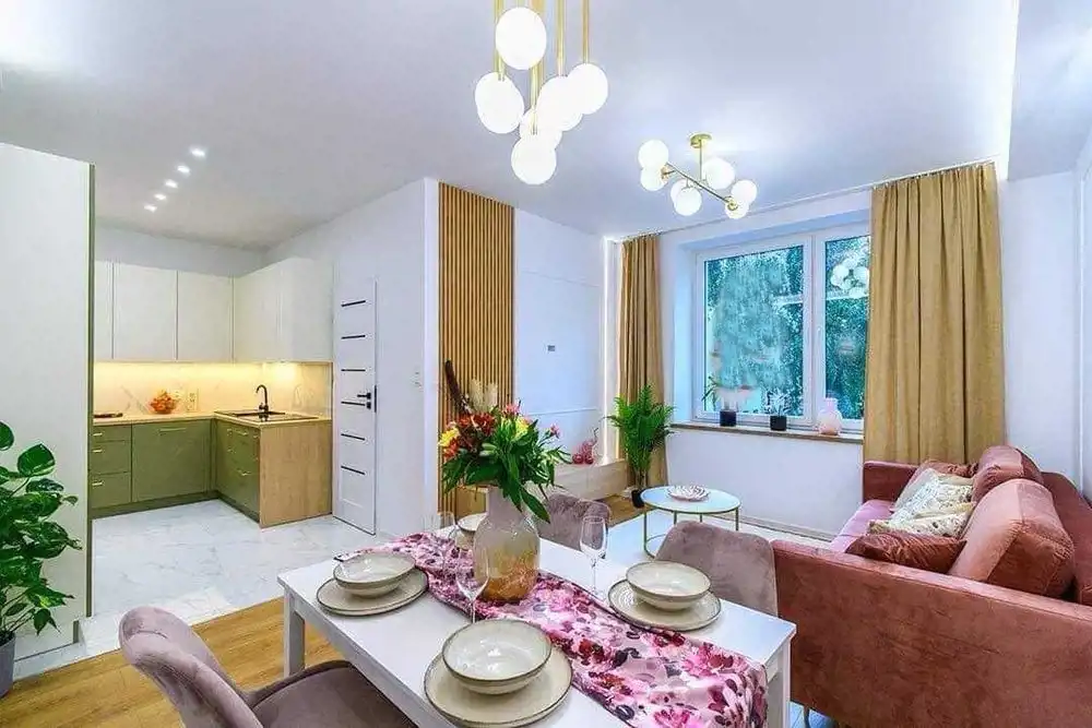 W pełni wyposażone i urządzone w ciepłych i jasnych kolorach. Meble wykonane na wymiar zgodnie z najnowszymi trendami jak i doposażone (np.ogrzewanie podłogowe).