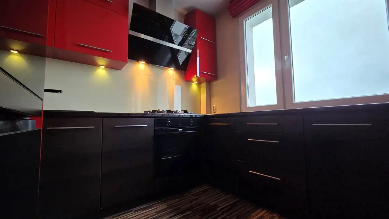 Mieszkanie po kapitalnym remoncie, o zmienionym układzie pomieszczeń, składa się z salonu z otwartą kuchnią, pokoju, sypialni z garderobą i balkonem, łazienki z wc oraz przedpokoju, o łącznej powierzchni użytkowej 64 m2. Do mieszkania przynależy piwnica.
