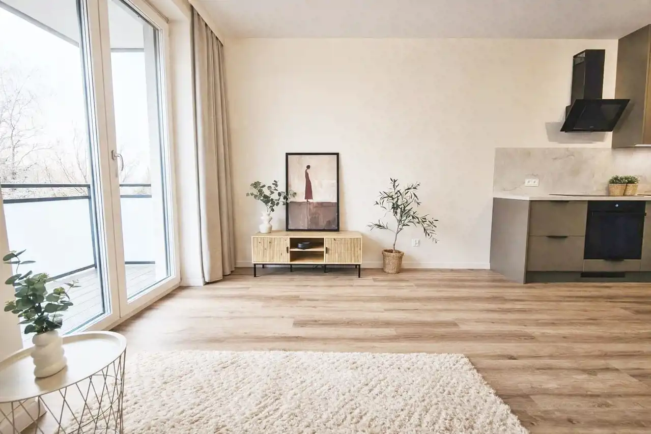 -salon z aneksem kuchennym oraz wyjściem na balkon