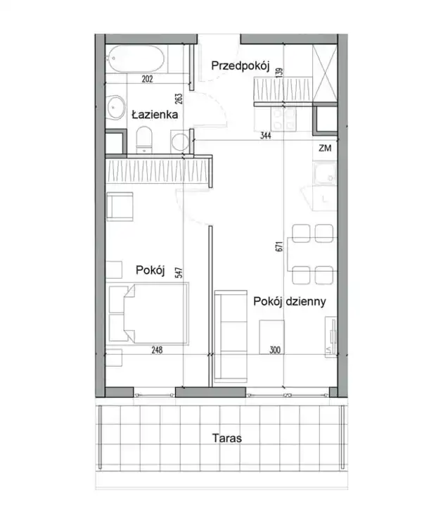 POKÓJ: 13.51 m2 PRZEDPOKÓJ: 4.7 m2 ŁAZIENKA: 4.95 m2 POKÓJ DZIENNY: 20.11 m2 + TARAS: 8.95 m2