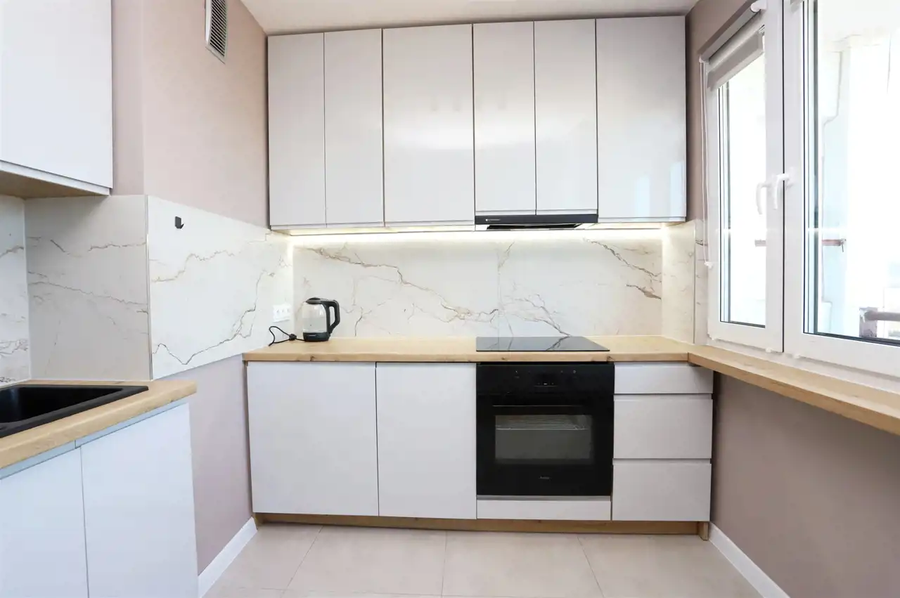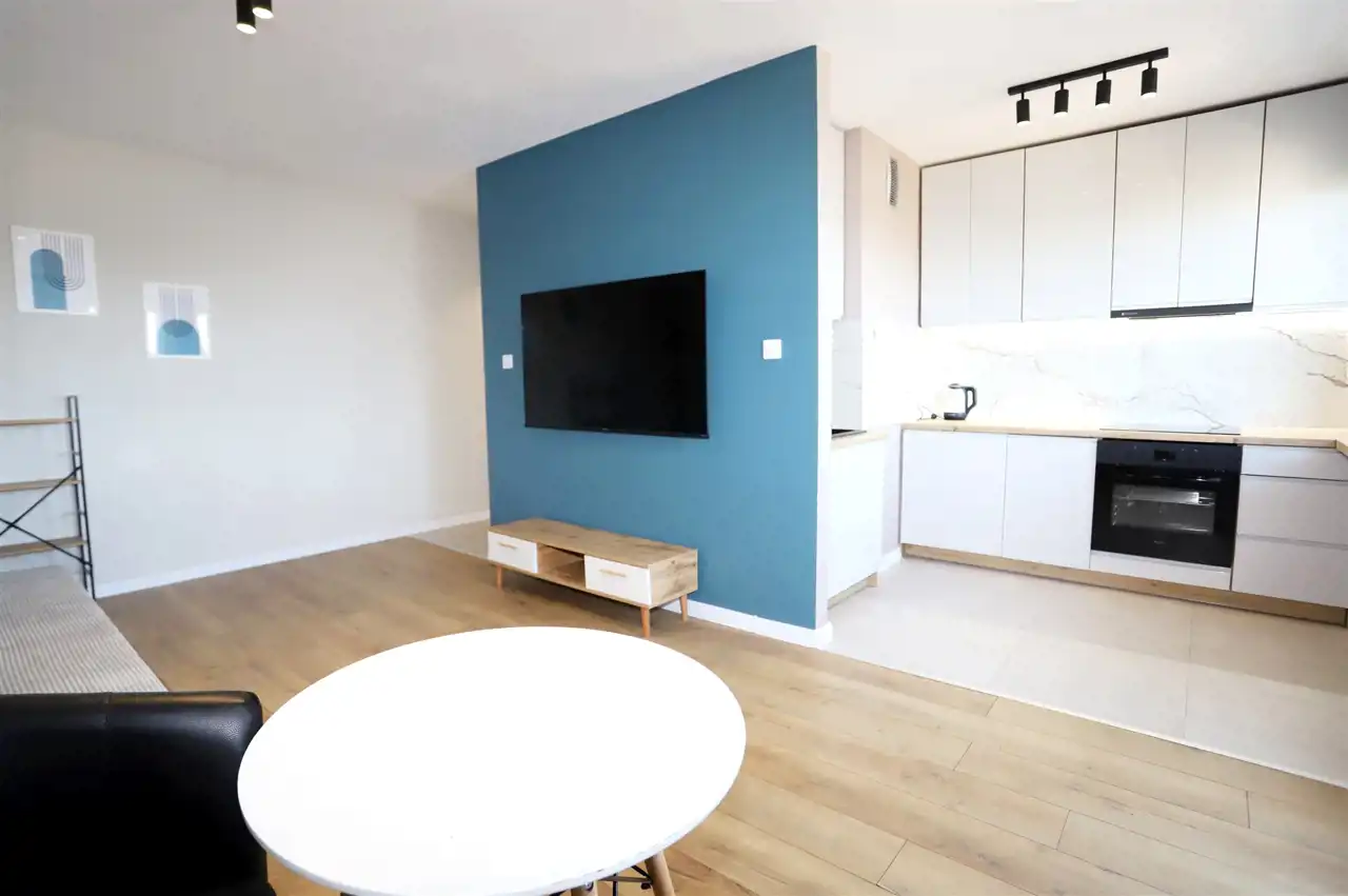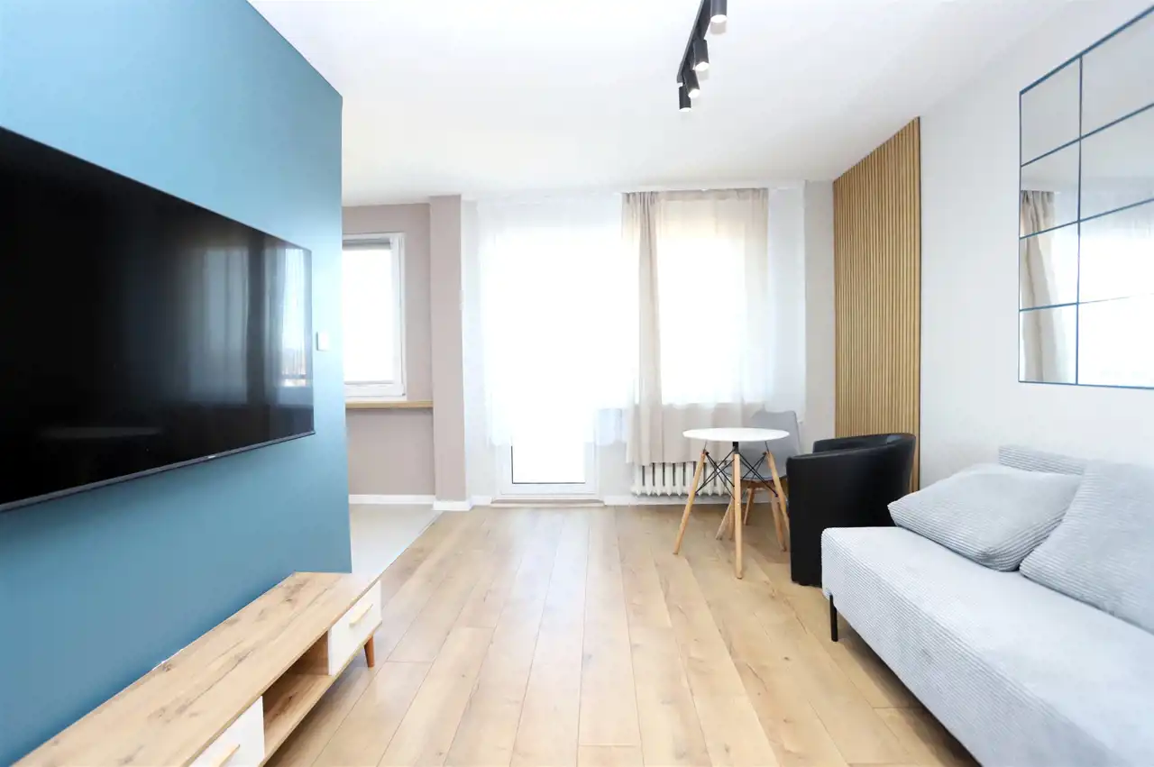 Mieszkanie usytuowane jest na ósmym piętrze w dziesięciopiętrowym bloku. Nieruchomość składa się ze słonecznego i przestronnego salonu z aneksem kuchennym oraz bezpośrednim wyjściem na spory balkon, urokliwej sypialni, łazienki wraz z toaletą oraz przedpokoju. Mieszkanie przeszło generalny remont z użyciem wysokiej jakości materiałów wykończeniowych oraz zostało stylowo urządzone. Salon wyposażony jest w rozkładaną dwuosobową sofę, stół z krzesłami oraz szafkę RTV wraz z telewizorem. W sypialni znajdziemy duże łóżko sypialniane oraz komodę. W kuchni natomiast znajdziemy meble kuchenne wraz ze sprzętami tj lodówka, płyta indukcyjna, piekarnik, zmywarka. W łazience dodatkowo znajduję się pralka, a w przedpokoju jest pojemna szafa z lustrem. Mieszkanie gotowe do natychmiastowego zamieszkania, dodatkowo oferuje piękny widok na Wałbrzyskie Góry.