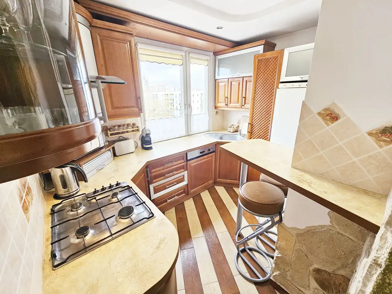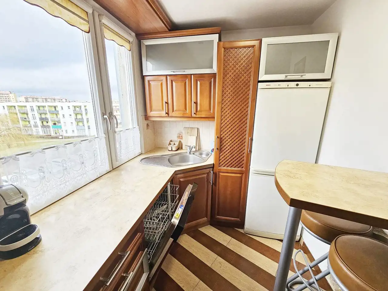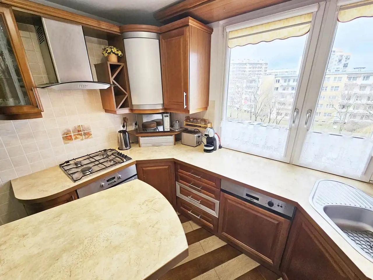 Kuchnia - w pełni wyposażona: lodówka, zmywarka, piekarnik, płyta gazowa, okap, ekspres do kawy, podstawowy komplet naczyń