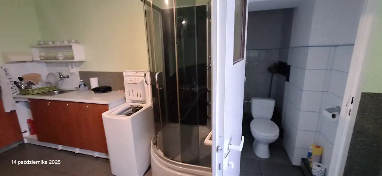 Parter ok 229,5 m2, h 235cm, z 3 wejściami na zewnątrz, 2 dużymi salami, z wc, kuchnią, pomieszczeniem na urządzenia fotowoltaiczne, na półpiętrze łazienka z kabiną ,