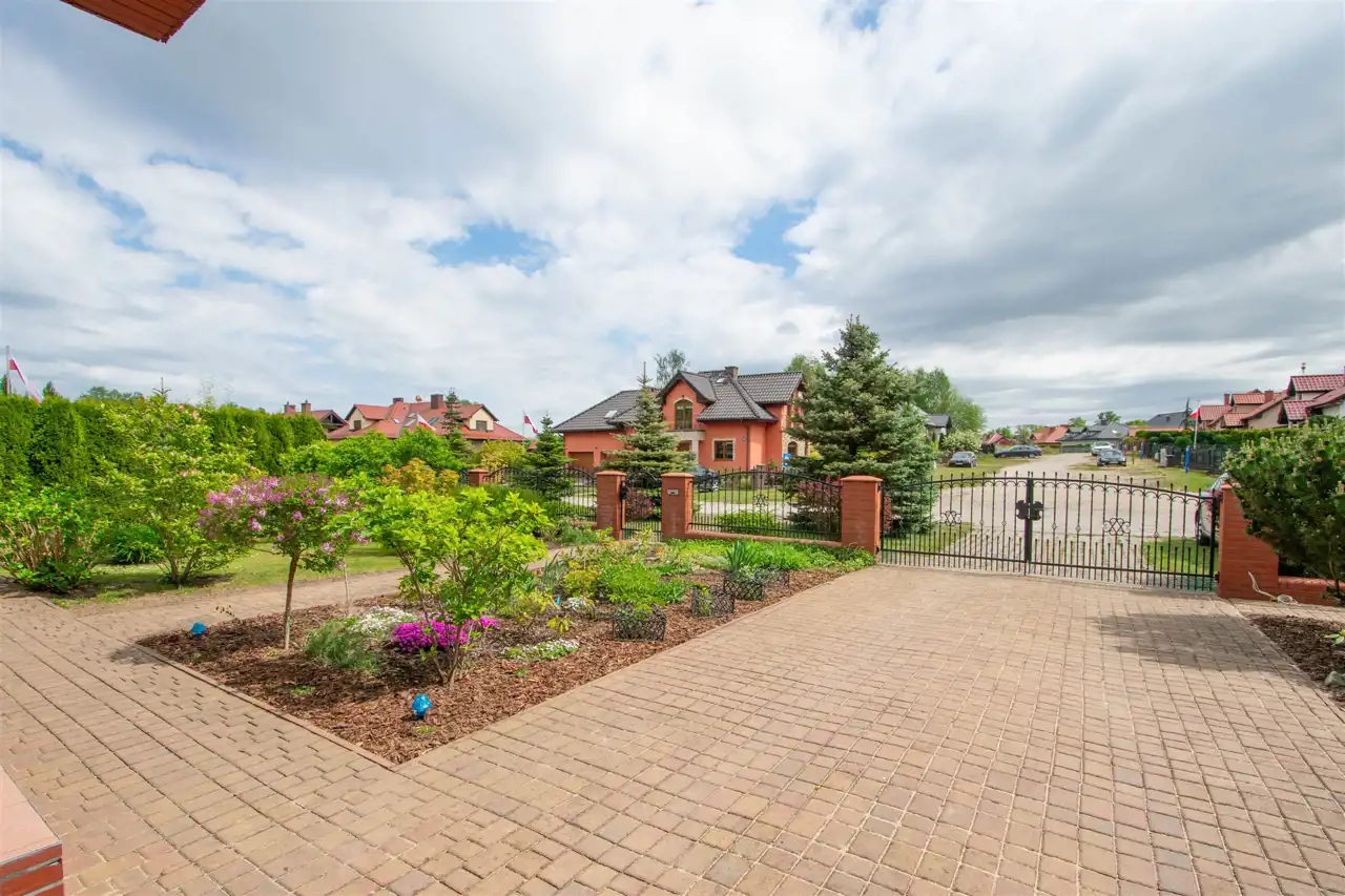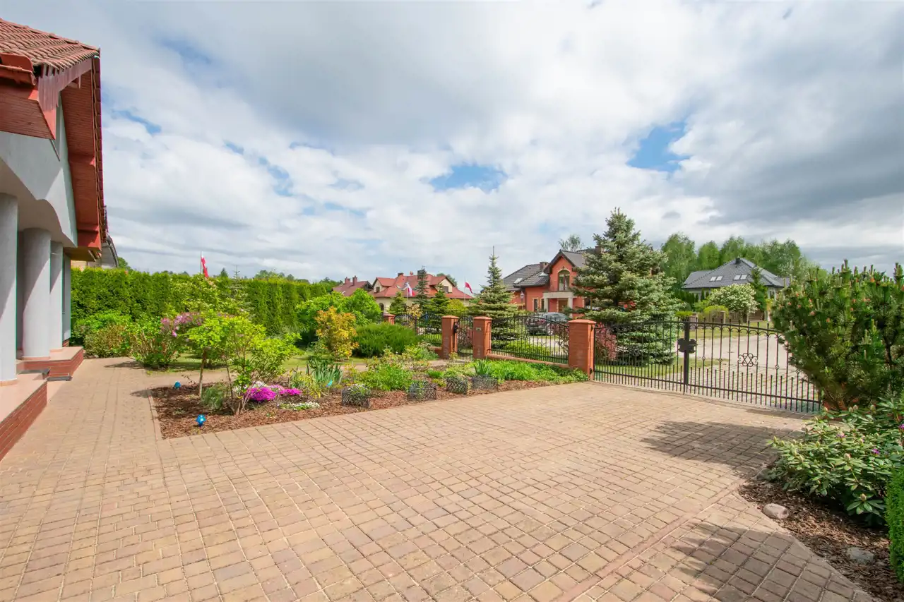 Podjazd do garażu oraz obejście wyłożone kostka brukową zapewniają estetykę i funkcjonalność.