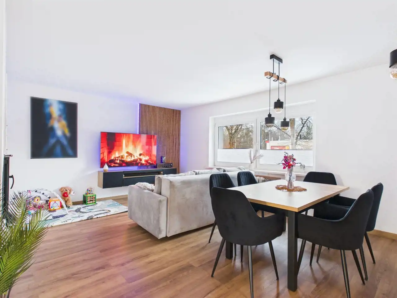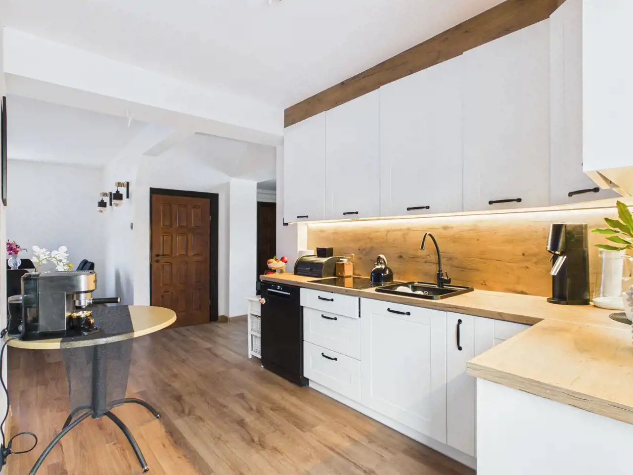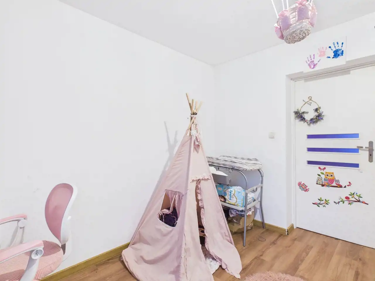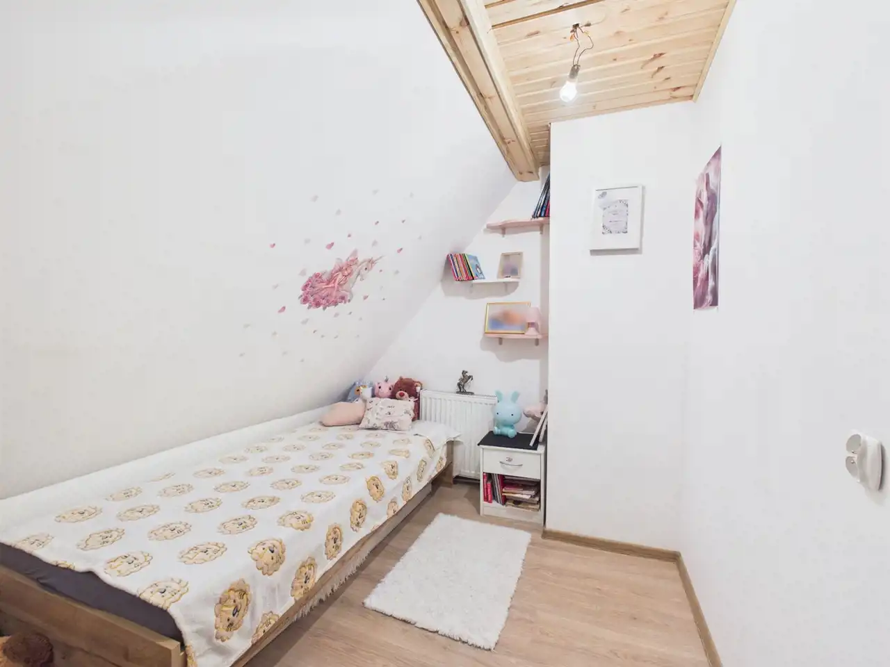 - Parter: jasny, przestronny salon i otwarta kuchnia z wyjściem na taras, pokój dziecięcy, łazienka.