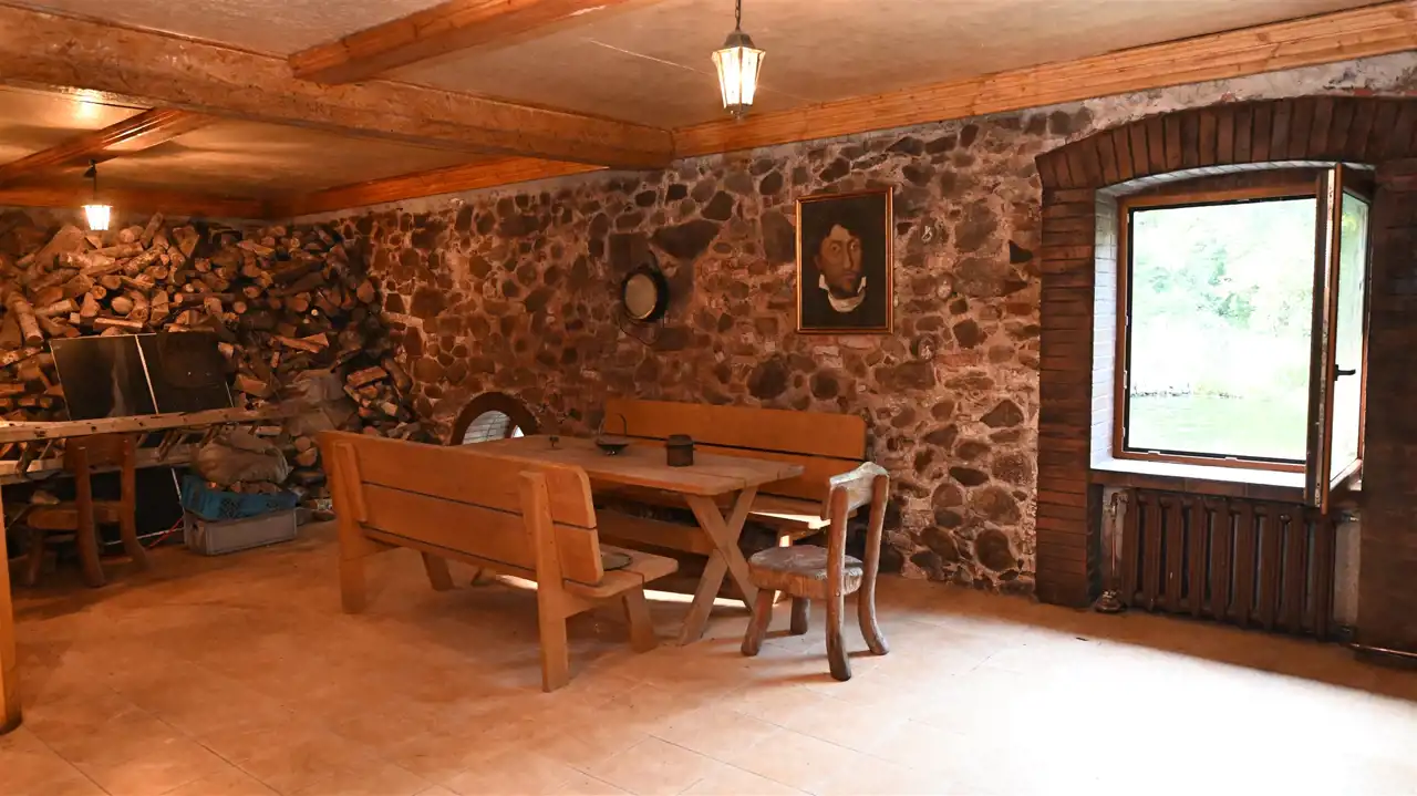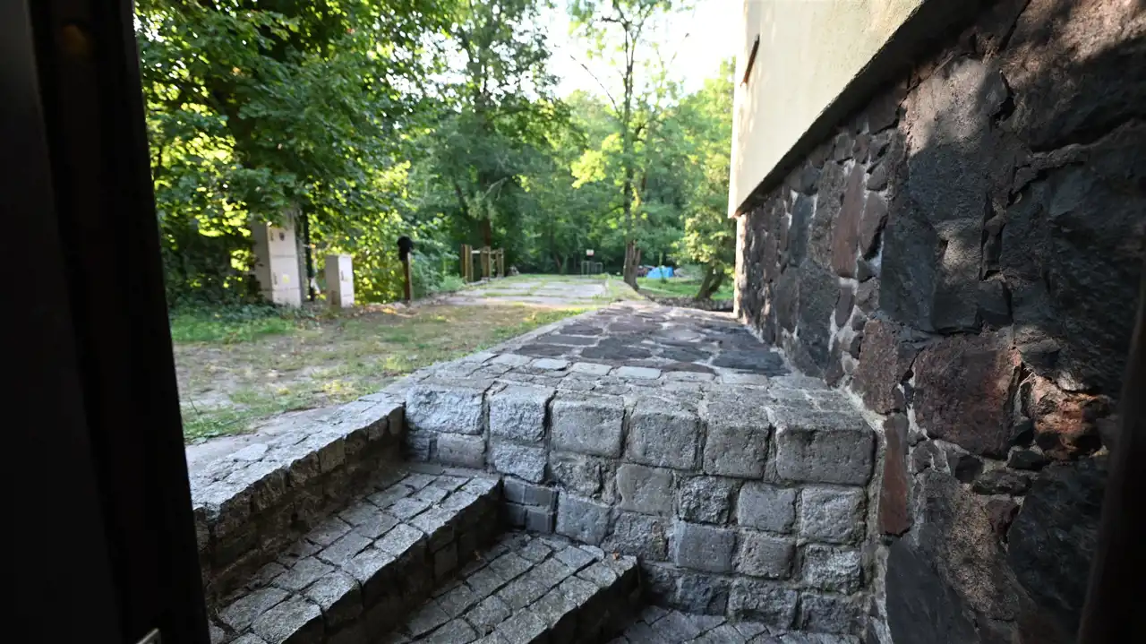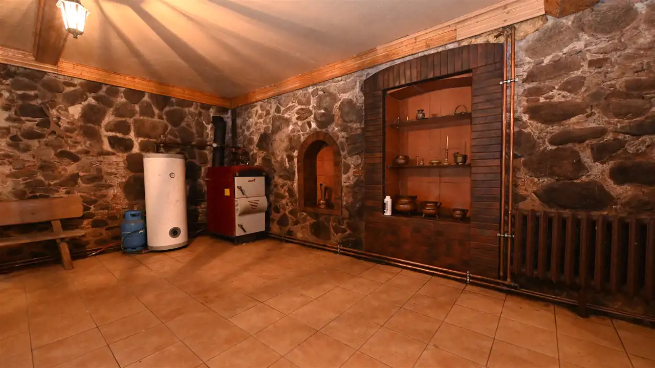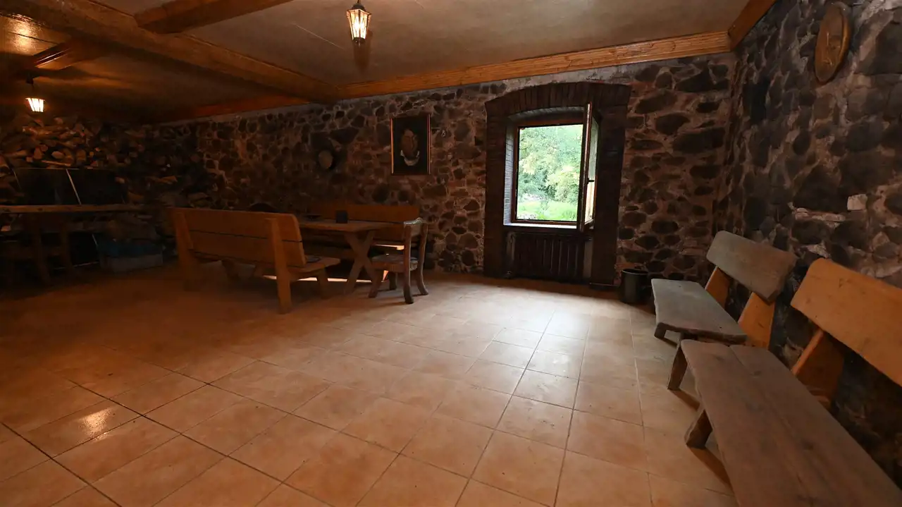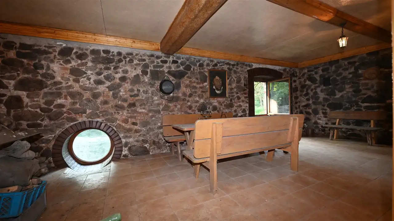 Kamienne fundamenty i ściany najniższej kondygnacji.