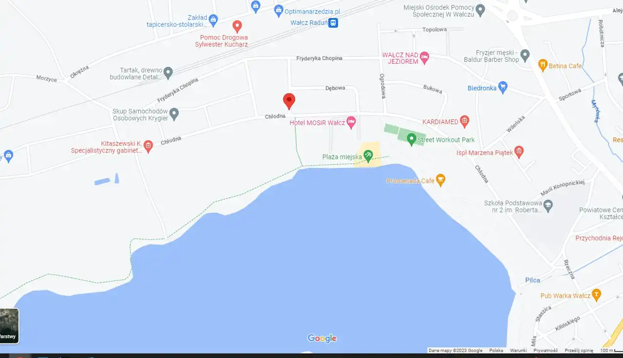 Dom znajduje się w Wałczu - miejscowości w województwie zachodniopomorskim, znanej z urokliwych jezior i rozbudowanej agroturystyki. Wałcz to miejscowość typowo turystyczna "sezonowa", oferująca niesamowite warunki przyrodnicze - dwa jeziora położone dosłownie obok siebie. Budynek znajduję się 50 metrów w linii prostej od brzegu jeziora Raduń, przy ulicy Chłodnej, jest to miejsce idealne na wakacyjny odpoczynek lub odetchnięcie od codziennego zgiełku miejskiego. Obok domu liczne lasy, parki, park linowy, ścieżki rowerowe oraz liczne punkty handlowo - usługowe.