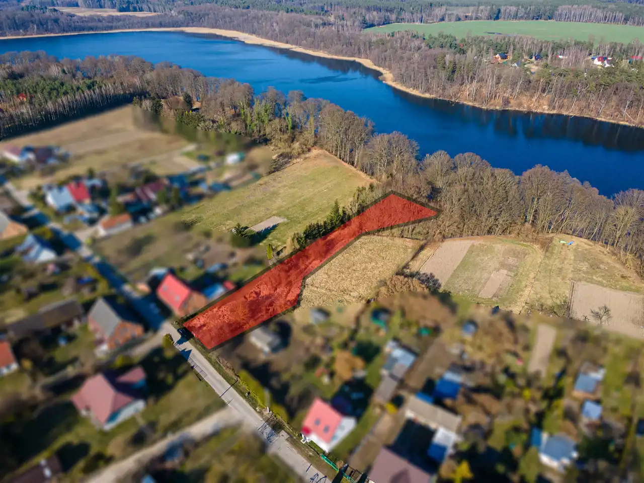 - Swoboda aranżacji: Nieregularny kształt działki pozwala na dowolną aranżację przestrzeni. Możesz wybudować dom od frontu, przy drodze, a od strony jeziora stworzyć prywatną strefę relaksu z tarasem, ogrodem i miejscem na ognisko.