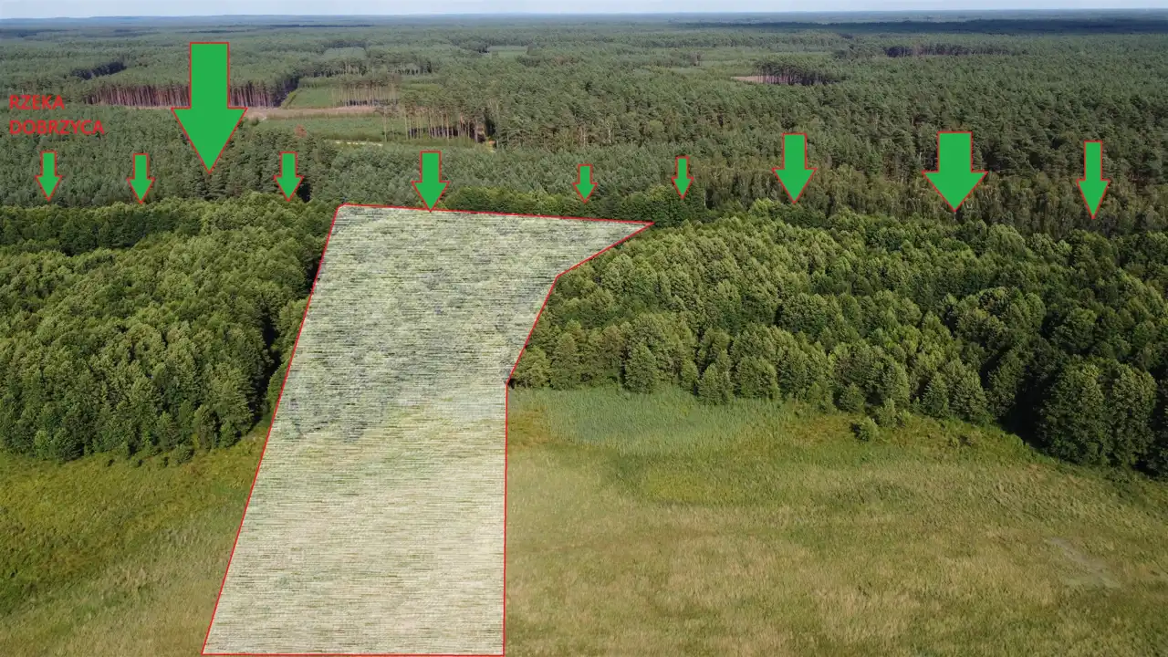 Front działki 30 m2. Długość działki i jednocześnie odległość do rzeki to 260 metrów. Odległość do lasu to około 130 metrów.