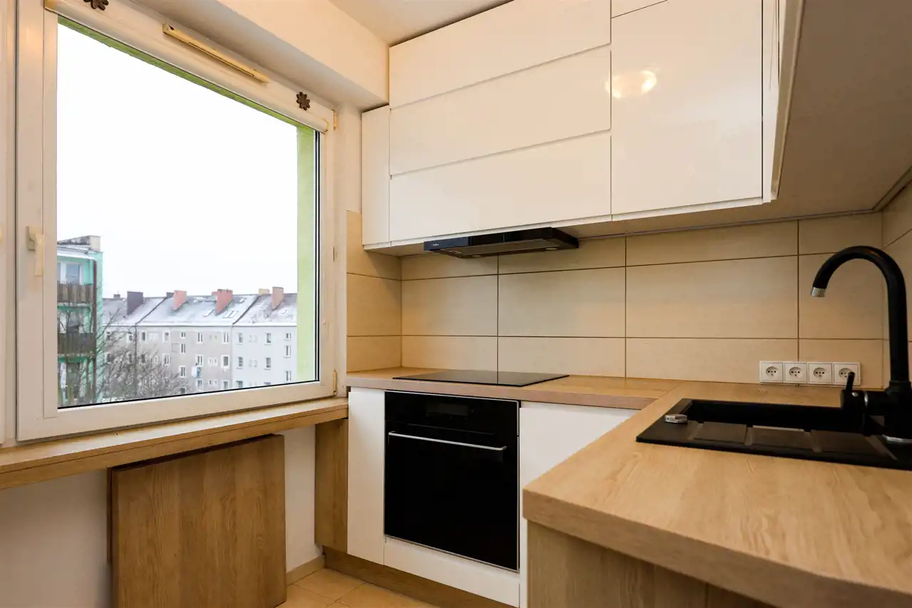 Jasna, oddzielna kuchnia wyposażona w nowoczesną zabudowę meblową, lodówkę, płytę indukcyjną oraz piekarnik.