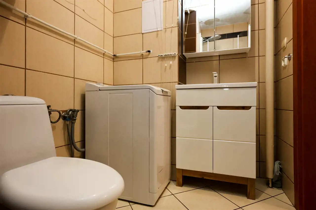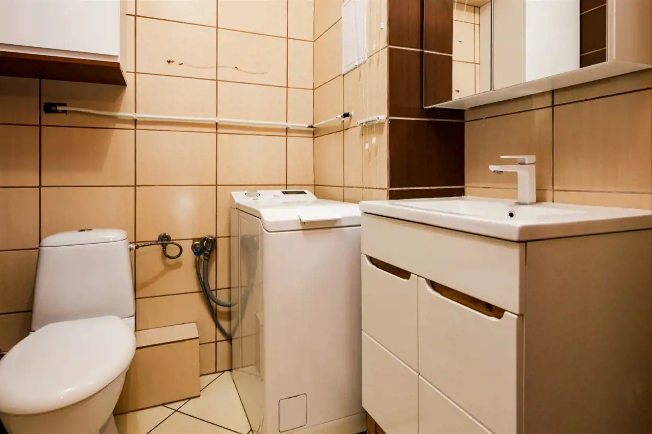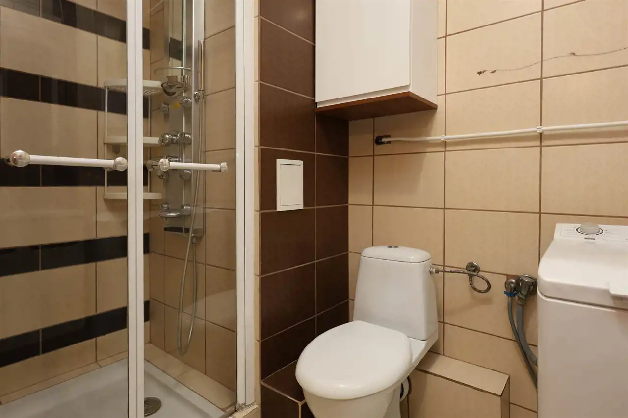 W łazience znajduje się prysznic, toaleta, umywalka z szafką i pralka.