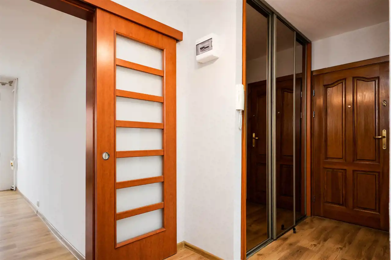 W przedpokoju w zabudowie pojemna szafa z lustrzanymi, przesuwnymi drzwiami.