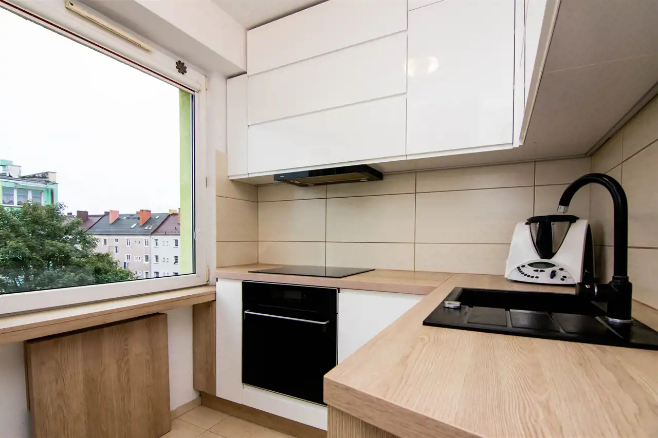 Jasna, oddzielna kuchnia wyposażona w nowoczesną zabudowę meblową, lodówkę, płytę indukcyjną oraz piekarnik.