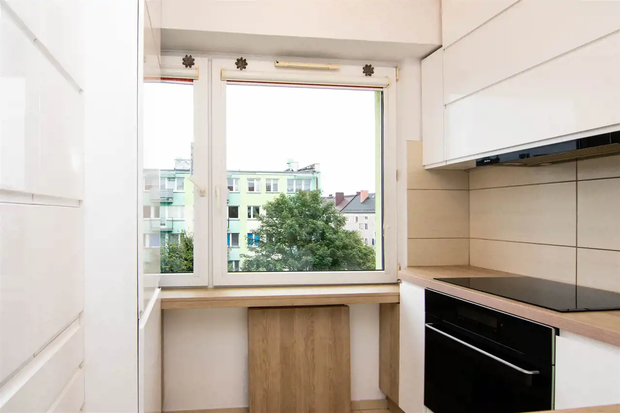 Na podłogach w sypialniach i korytarzu panele, natomiast w kuchni i łazience kafelki. Odmalowane, zadbane. W pokojach solidne, granitowe parapety.