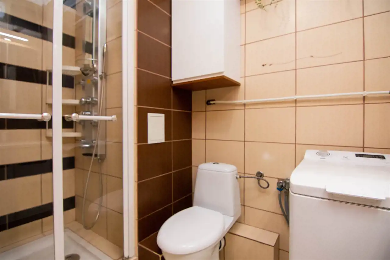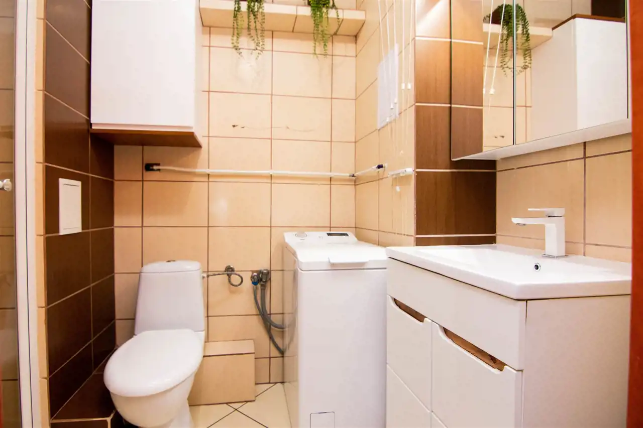 W łazience znajduje się prysznic, toaleta, umywalka z szafką i pralka.