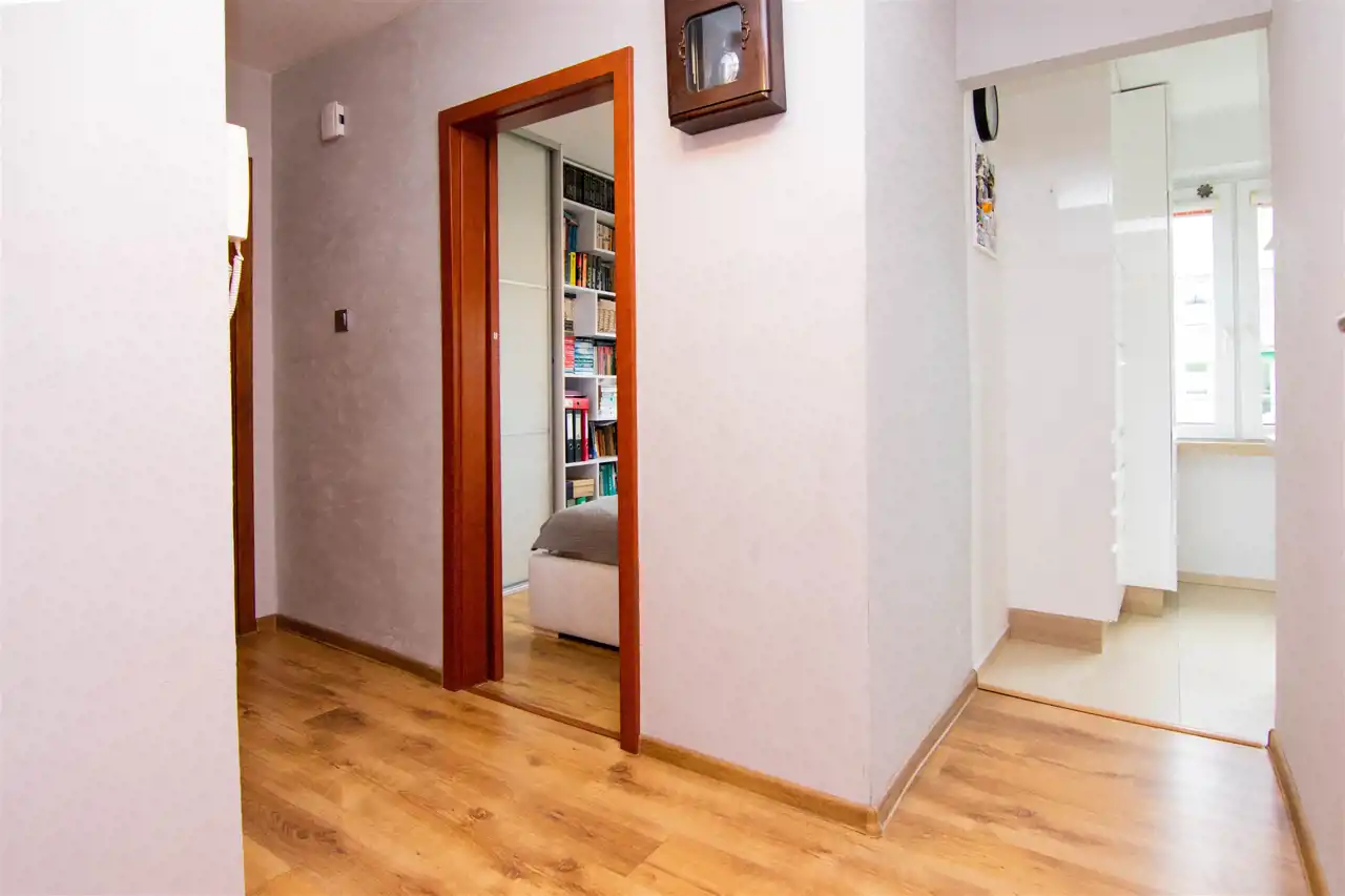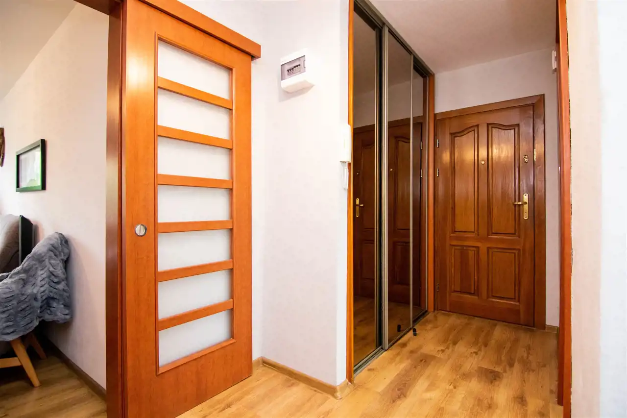 W przedpokoju w zabudowie pojemna szafa z lustrzanymi, przesuwnymi drzwiami.