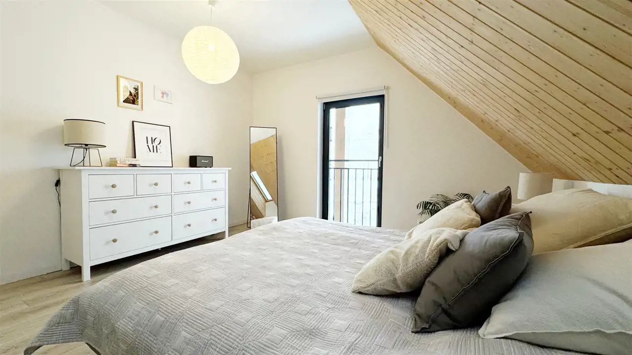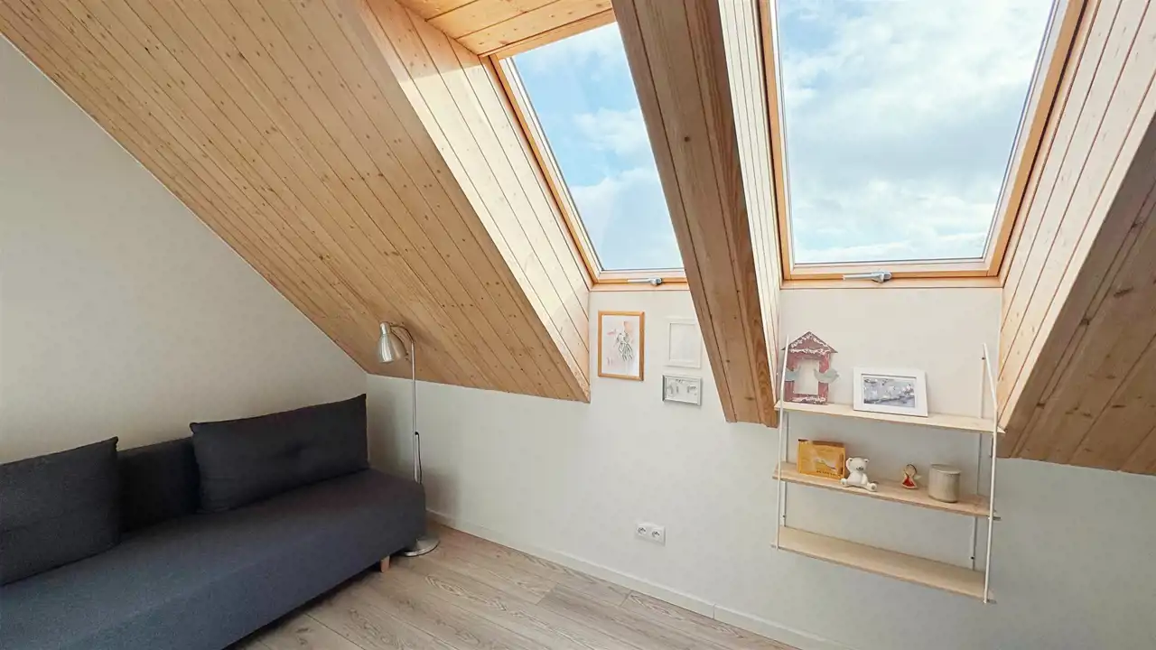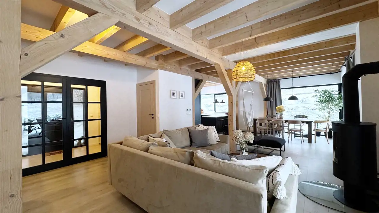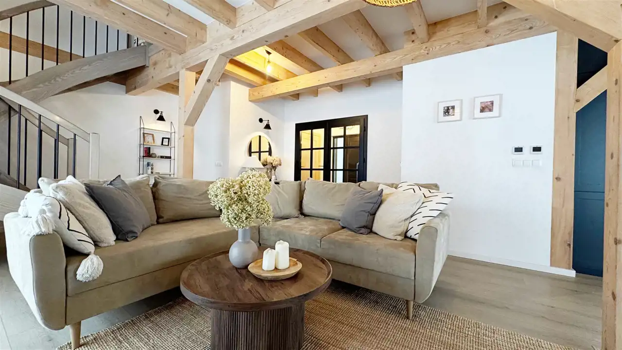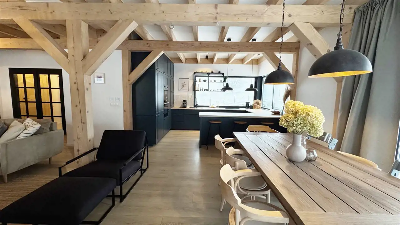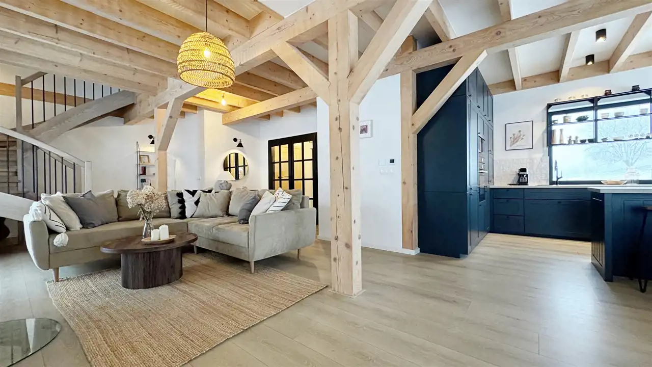 i spokojnych kolorów. Widoczna konstrukcja drewniana nadaje przestrzeni charakteru