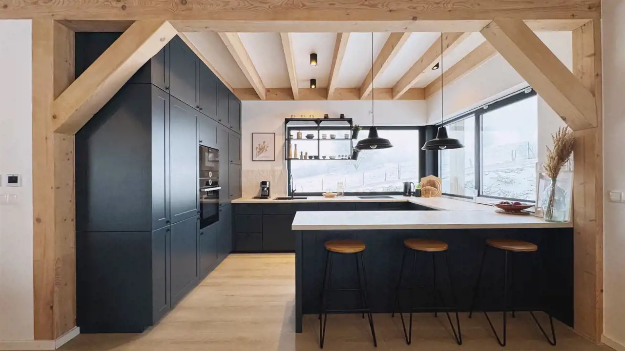 • antracytowa kuchnia w zabudowie - elegancki, nowoczesny akcent