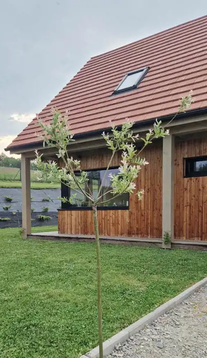 Dom posadowiony jest na dużej, zagospodarowanej działce o powierzchni 25 arów, położonej na lekkim wzgórzu. Nasadzenia drzew owocowych, trawy ozdobne i iglaki tworzą naturalną, prywatną enklawę. Otwarta przestrzeń łąk i zieleni zapewnia poczucie swobody, którego nie daje zabudowa osiedlowa.