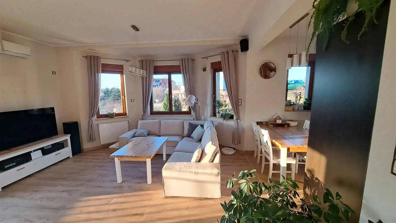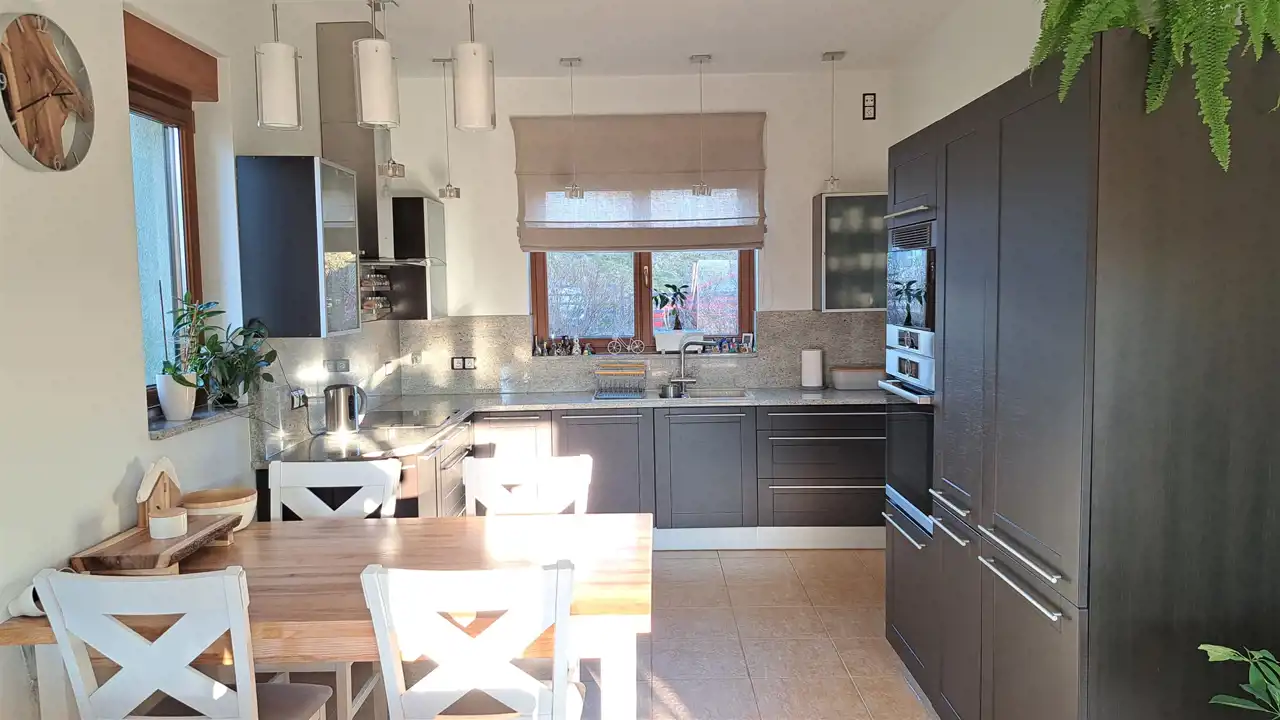 Każdy detal tej posiadłości jest przemyślany, od funkcjonalnego rozkładu, przez wysoko jakościowe rozwiązania techniczne po starannie zaaranżowany i wypielęgnowany ogród z oczkiem wodnym.