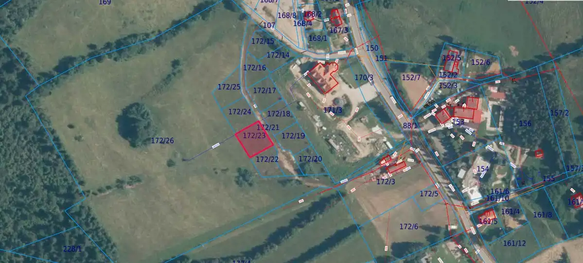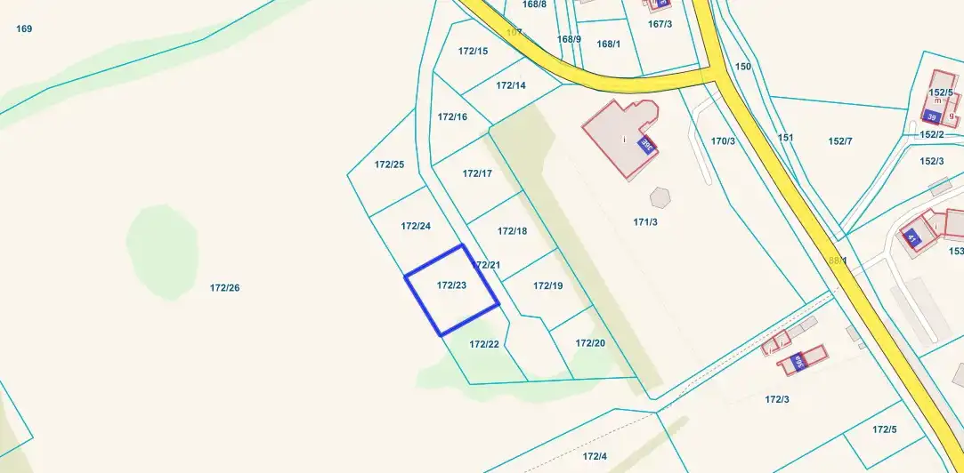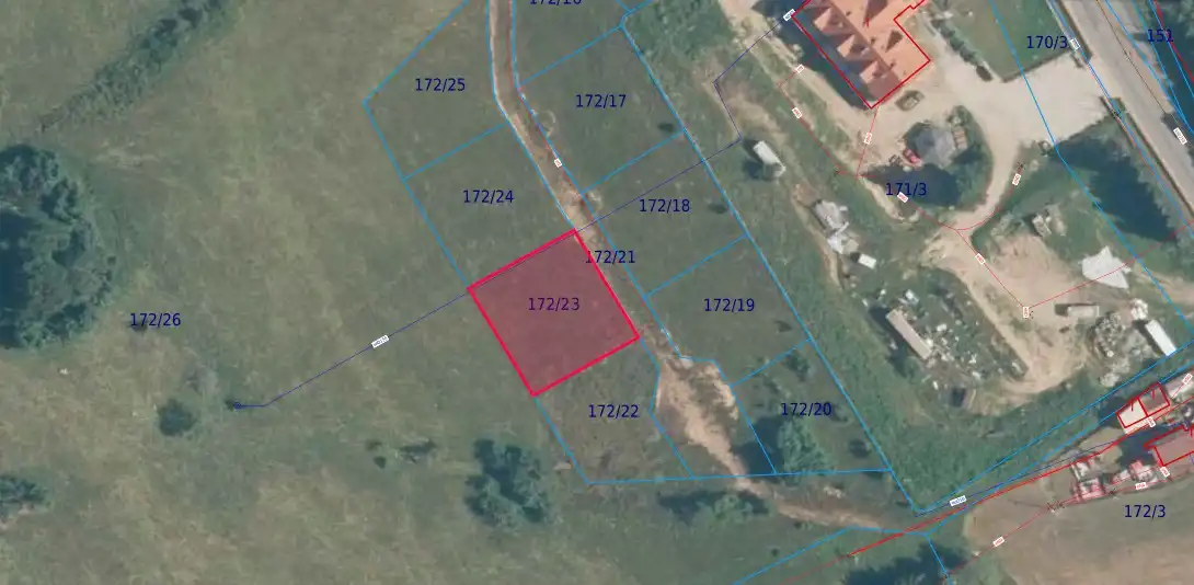 Działka nr 172/23 o powierzchni 879 m2, działka pochyła. Front działki wynosi ok. 30 m.