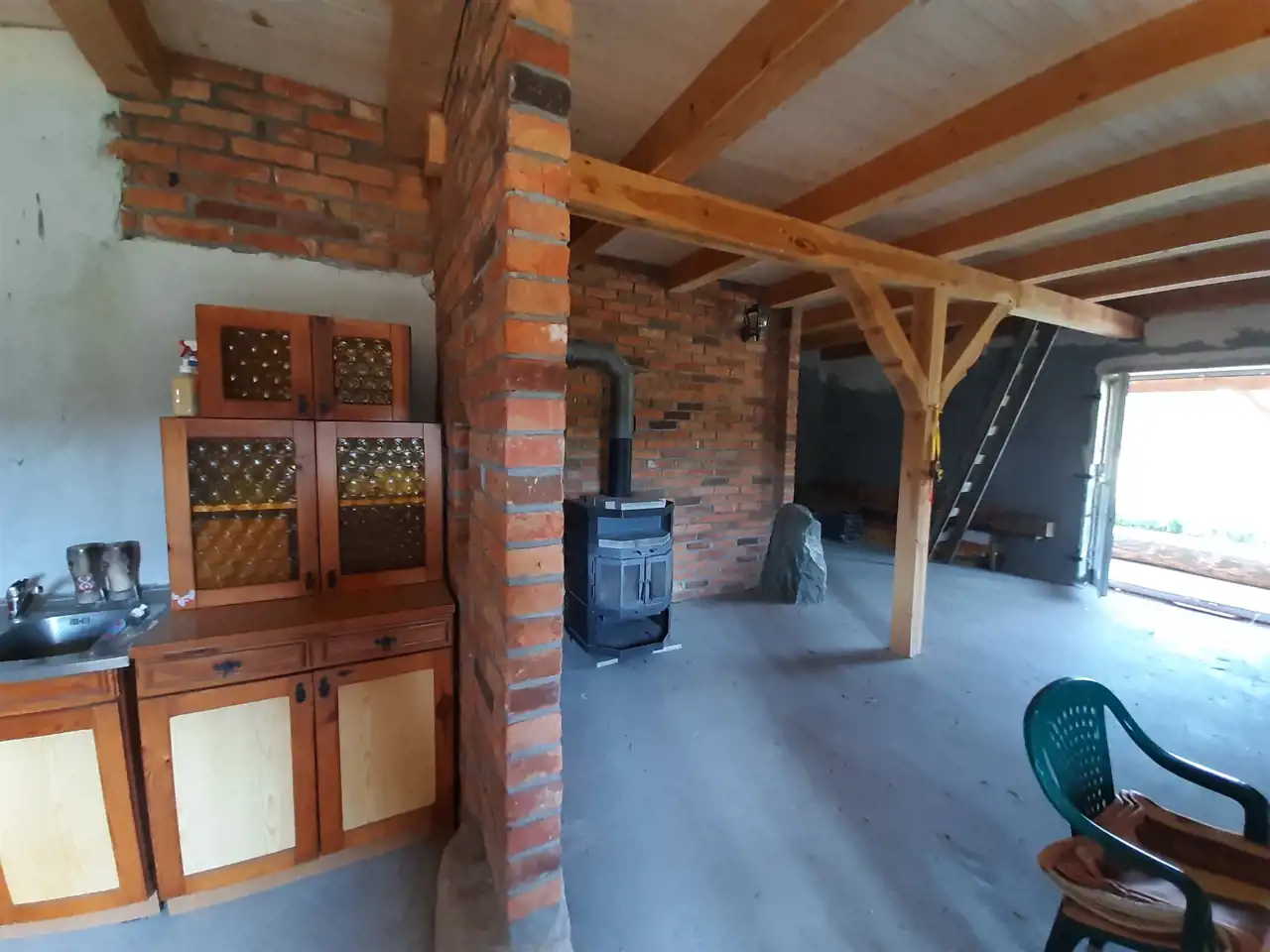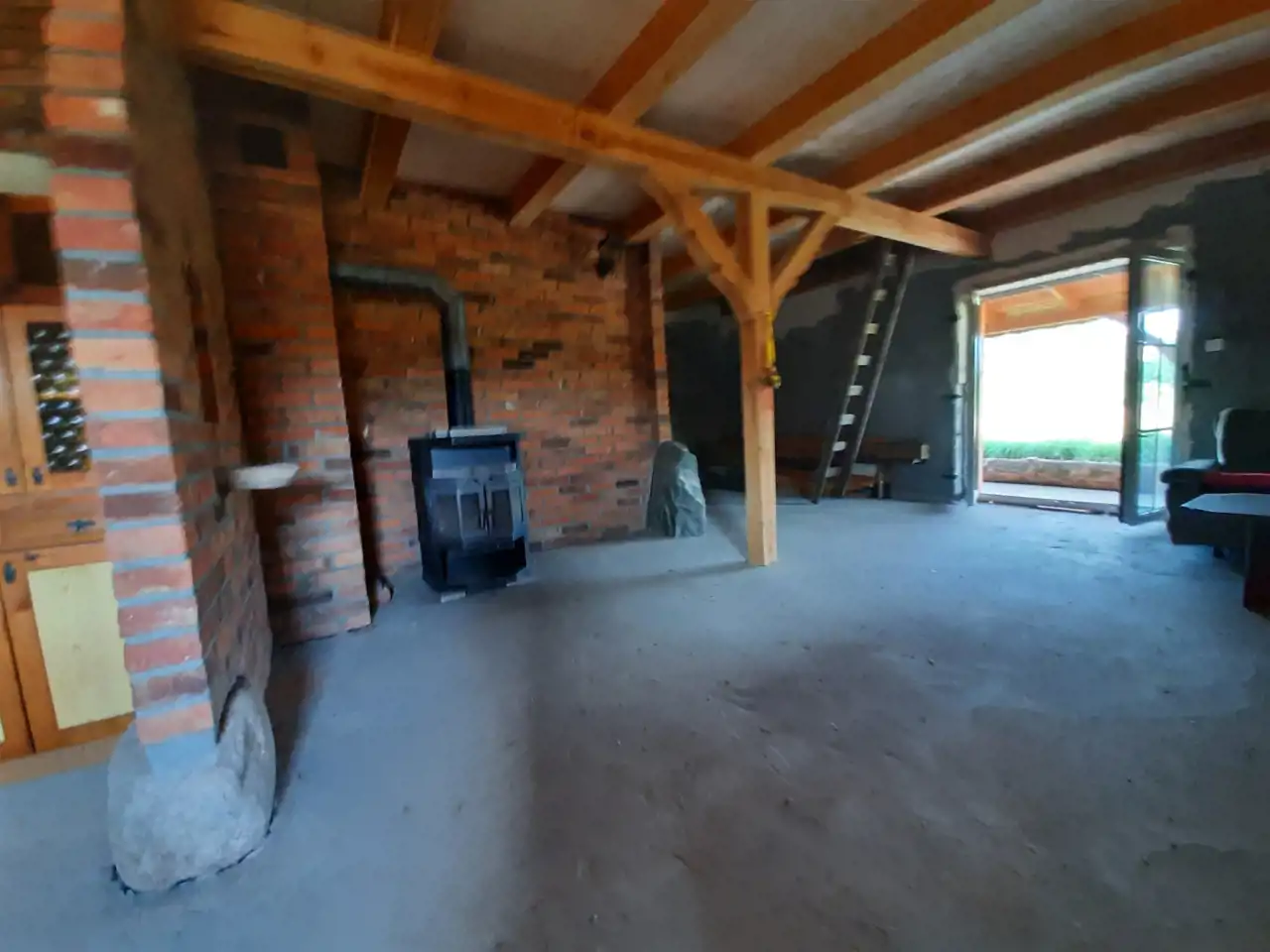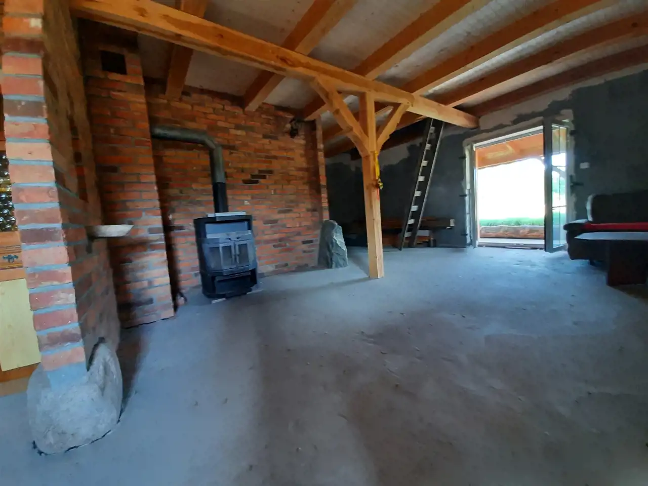 Dom w stanie do wykończenia: na parterze duża otwarta przestrzeń, salon z kuchnią oraz łazienka.
