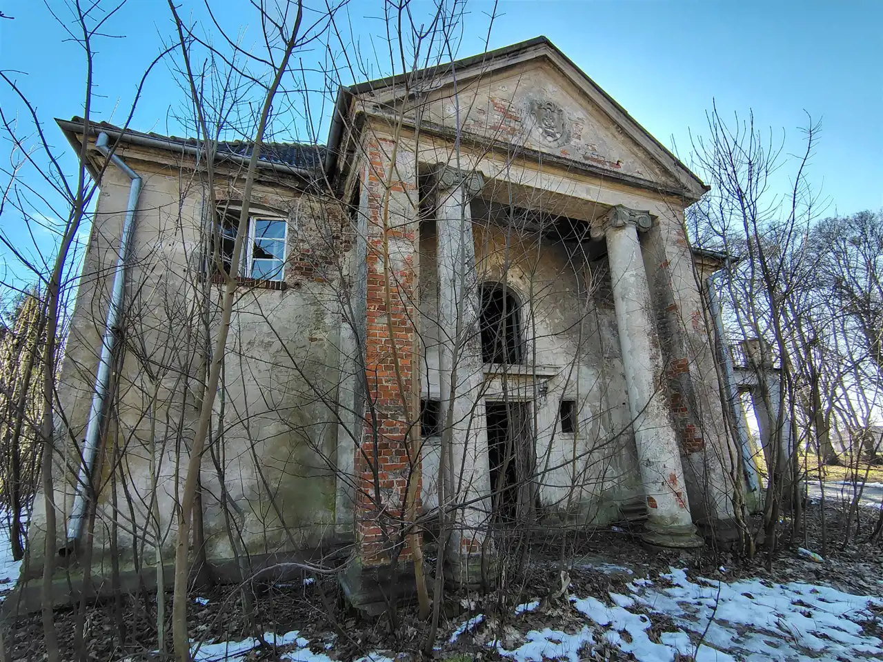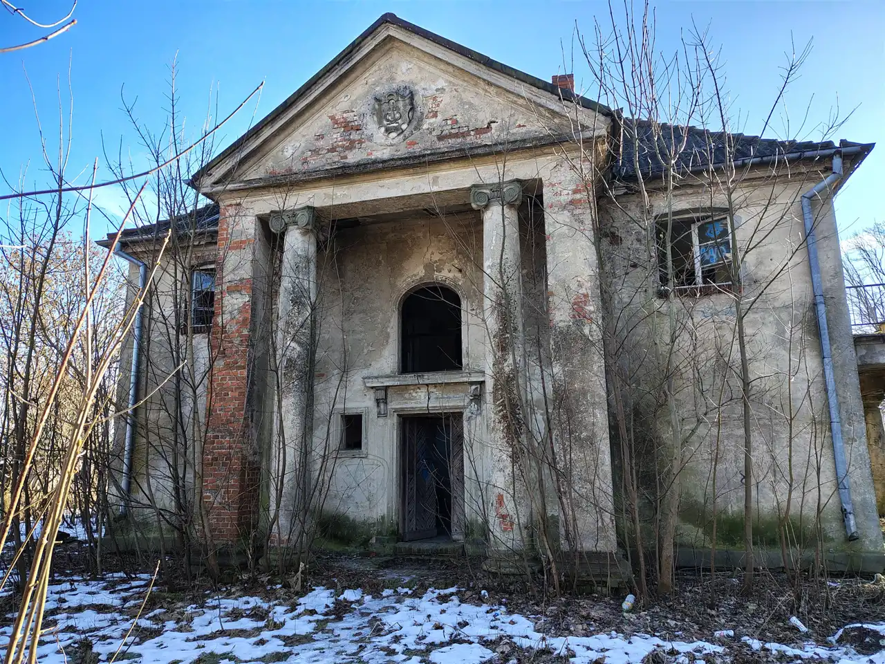 - Reprezentacyjne Wejście: Do wnętrza prowadzi dwukolumnowy portyk zwieńczony trójkątnym szczytem, w którym do dziś widnieje herb właścicieli.