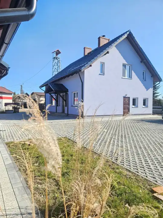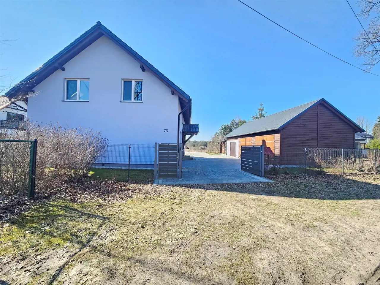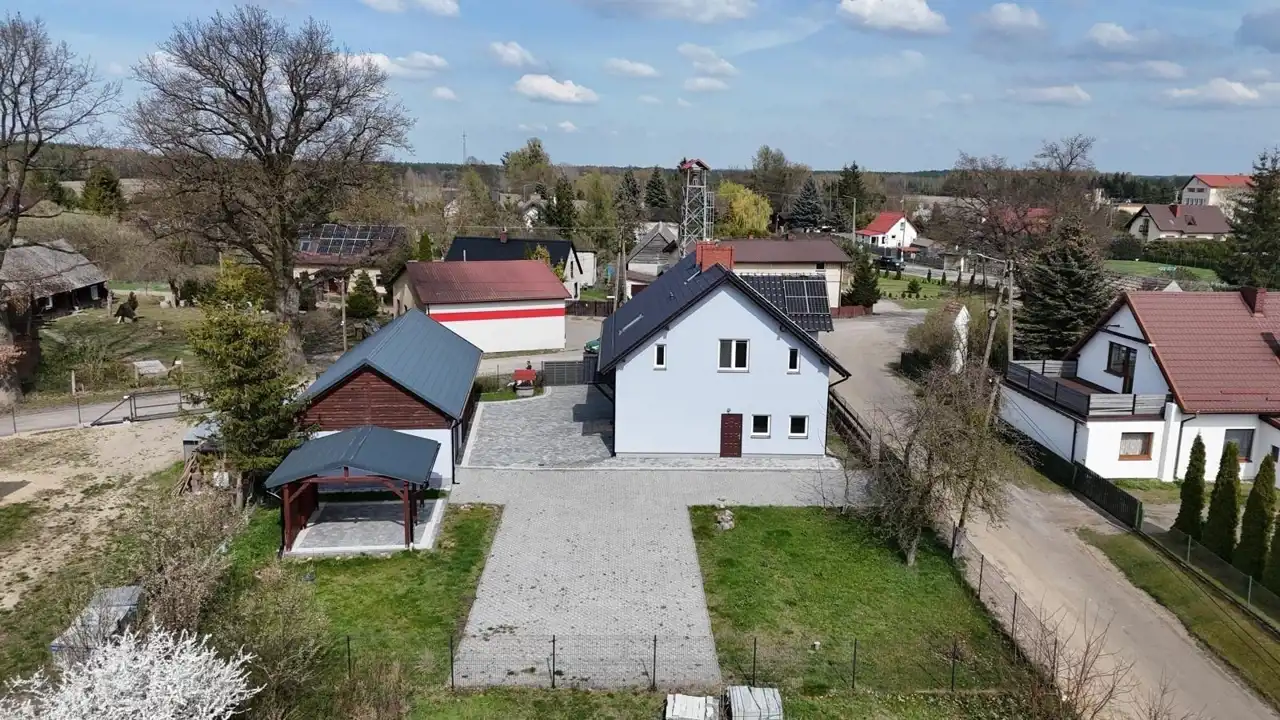 Teren zielony wokół domu sprzyja odpoczynkowi, oferując zadbany trawnik oraz drewnianą altanę, na której można cieszyć się świeżym powietrzem i pięknymi widokami na otaczającą przyrodę. Otoczenie domu jest również idealne na spacery, rowerowe wycieczki oraz obserwację dzikiej przyrody.