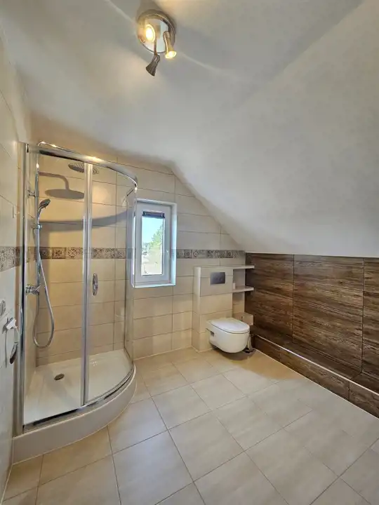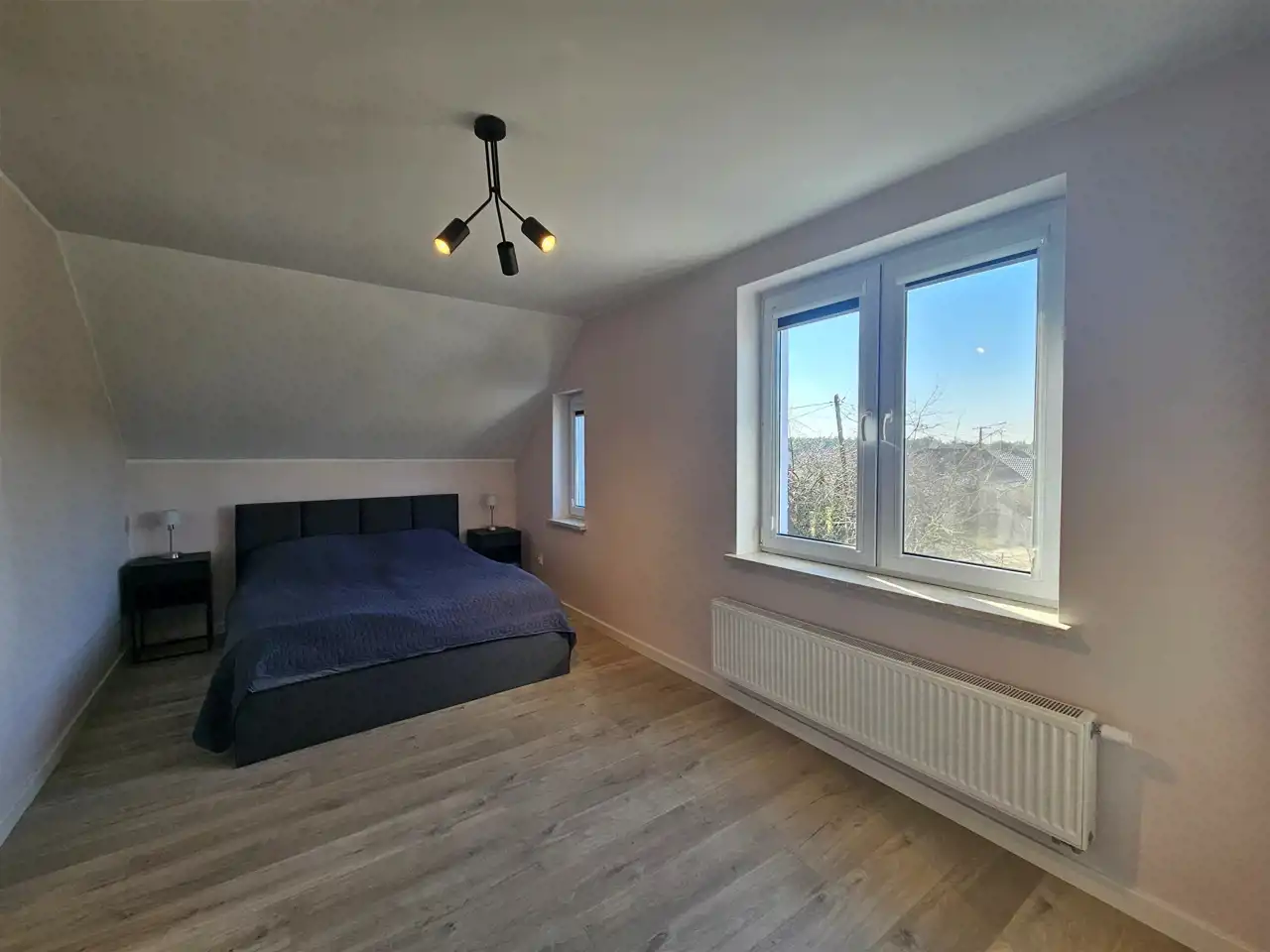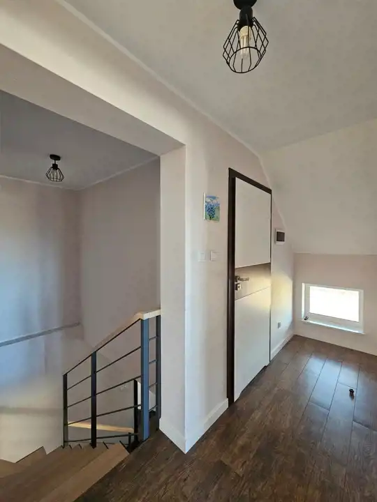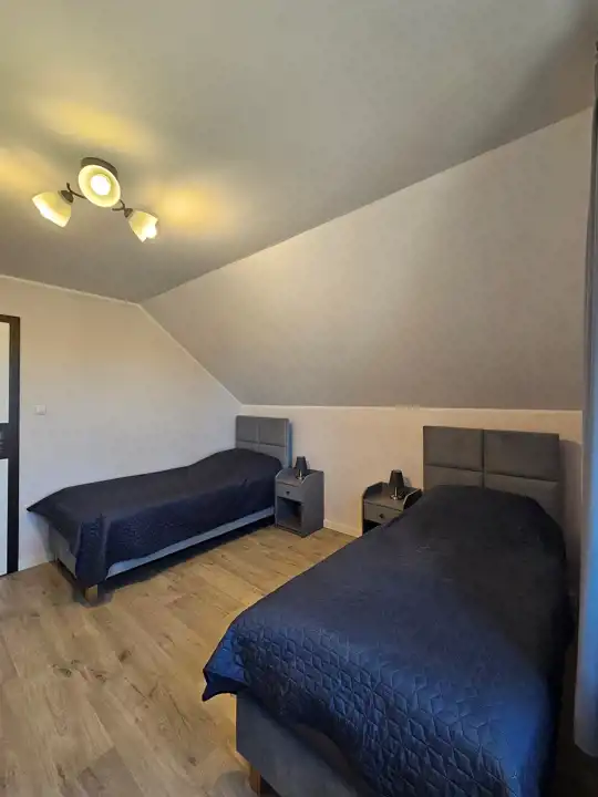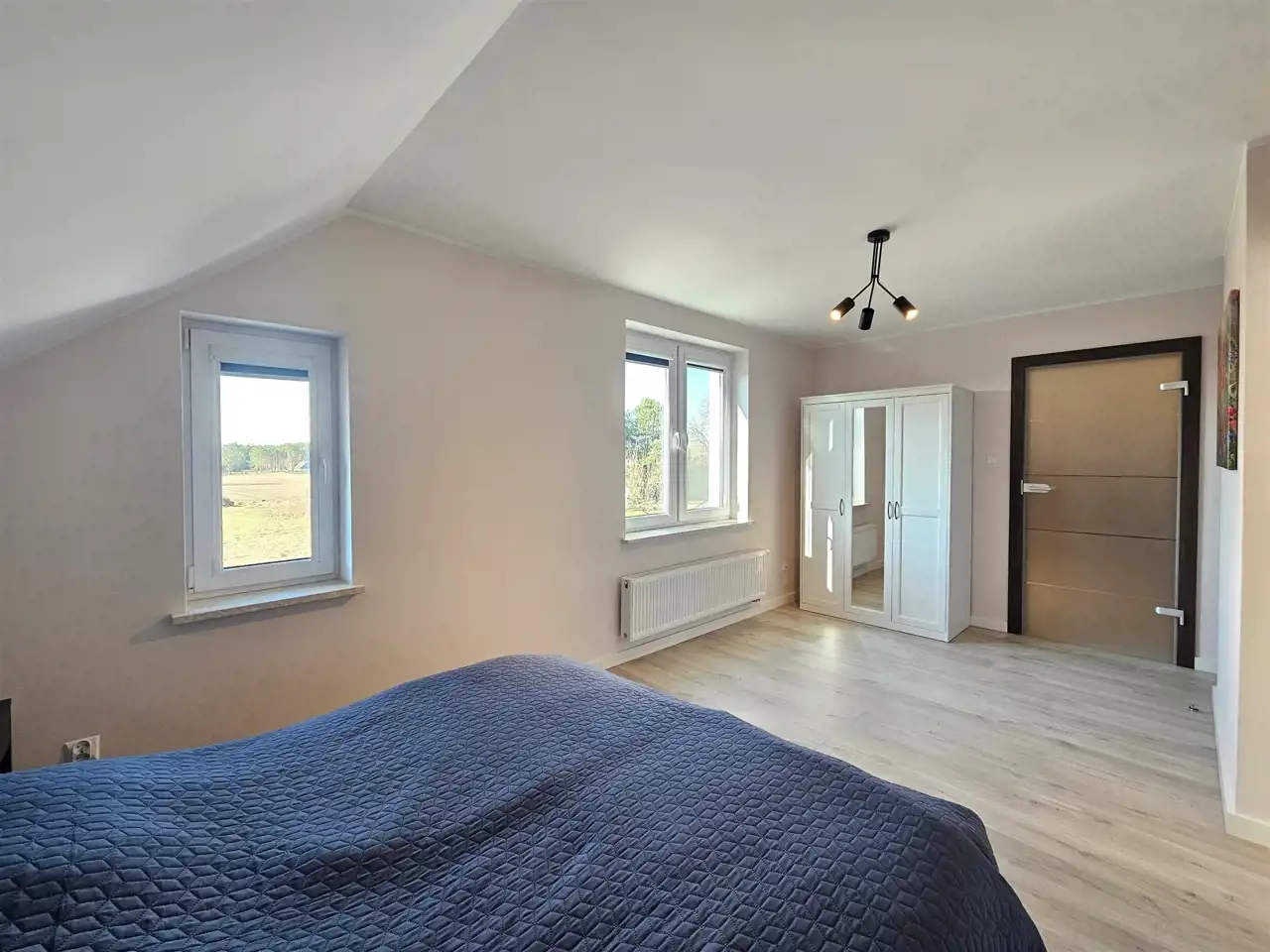 Na parterze znajduje się przestronny salon z aneksem kuchennym, wyposażony w nowoczesne urządzenia, takie jak lodówka, zmywarka, płyta indukcyjna, okap i piekarnik elektryczny. W salonie znajduje się również wolnostojący kominek, który dodaje uroku wnętrzu. Dodatkowo na parterze znajduje się łazienka oraz pomieszczenie gospodarcze z kotłownią. Na górze znajdują się trzy sypialnie, pokój przejściowy i dwie łazienki z prysznicem. Wnętrze charakteryzuje się przytulną atmosferą, naturalnym światłem.