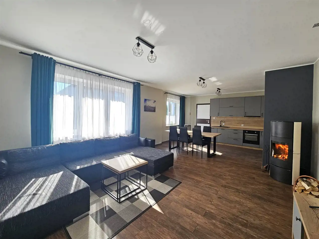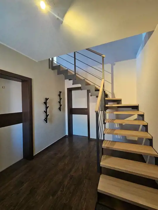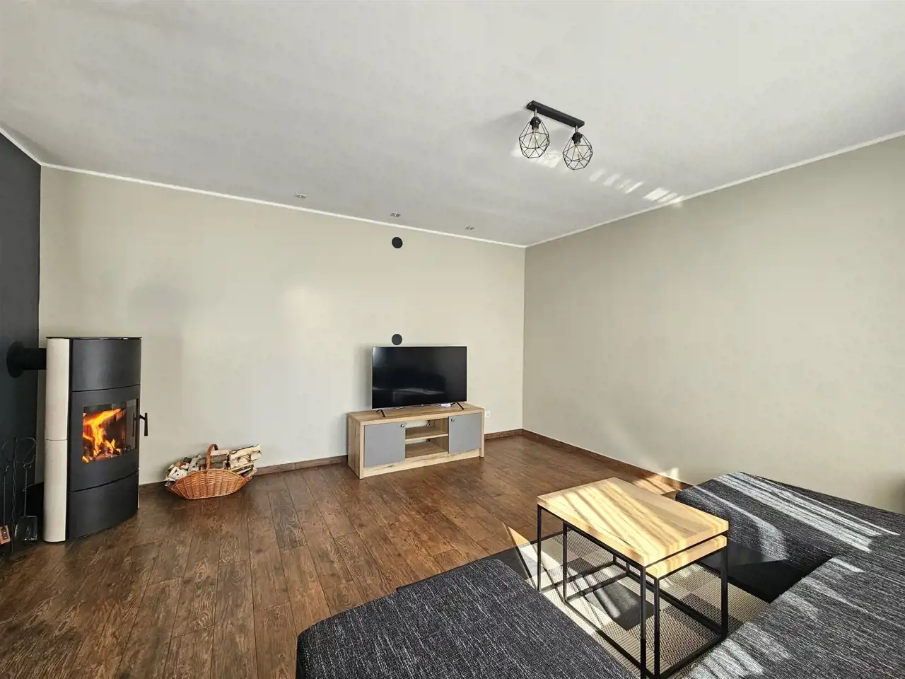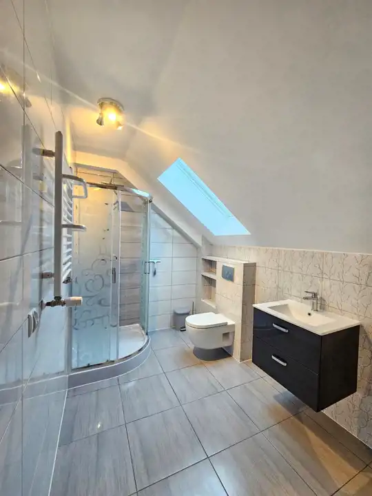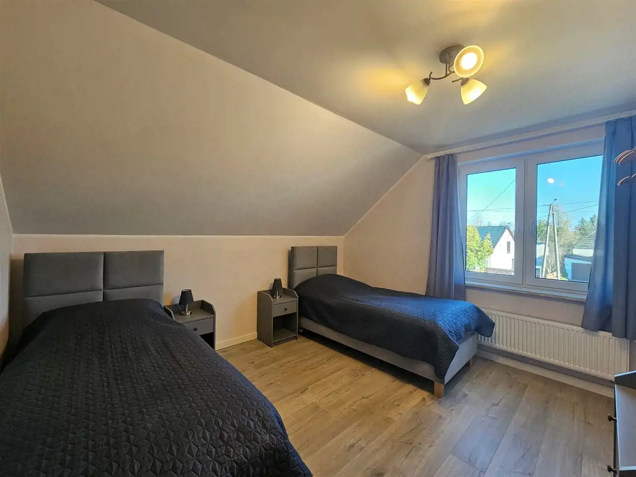 Na parterze znajduje się przestronny salon z aneksem kuchennym, wyposażony w nowoczesne urządzenia, takie jak lodówka, zmywarka, płyta indukcyjna, okap i piekarnik elektryczny. W salonie znajduje się również wolnostojący kominek, który dodaje uroku wnętrzu. Dodatkowo na parterze znajduje się łazienka oraz pomieszczenie gospodarcze z kotłownią. Na górze znajdują się trzy sypialnie, pokój przejściowy i dwie łazienki z prysznicem. Wnętrze charakteryzuje się przytulną atmosferą, naturalnym światłem.