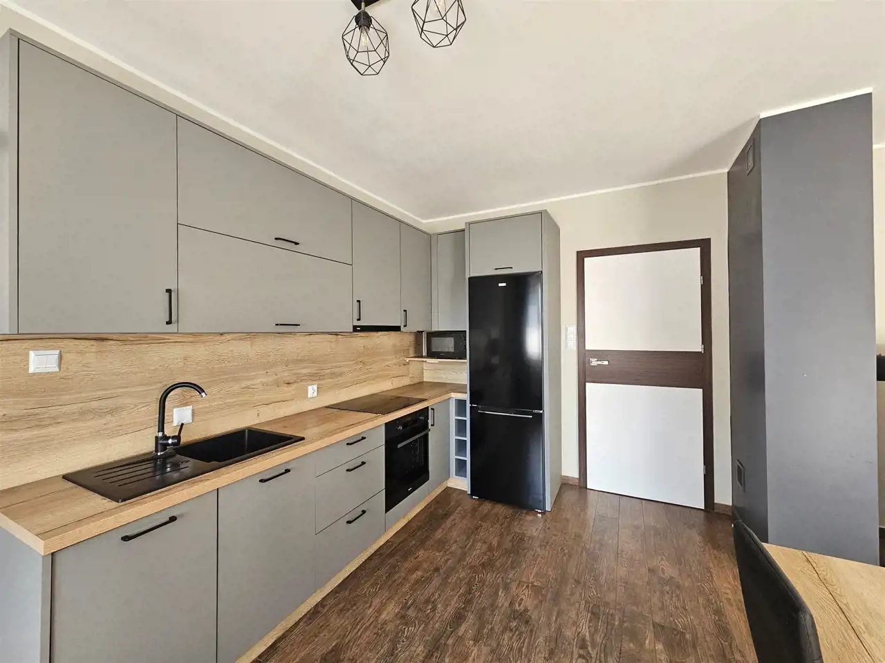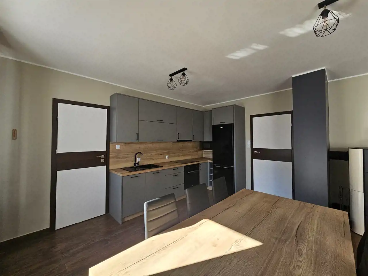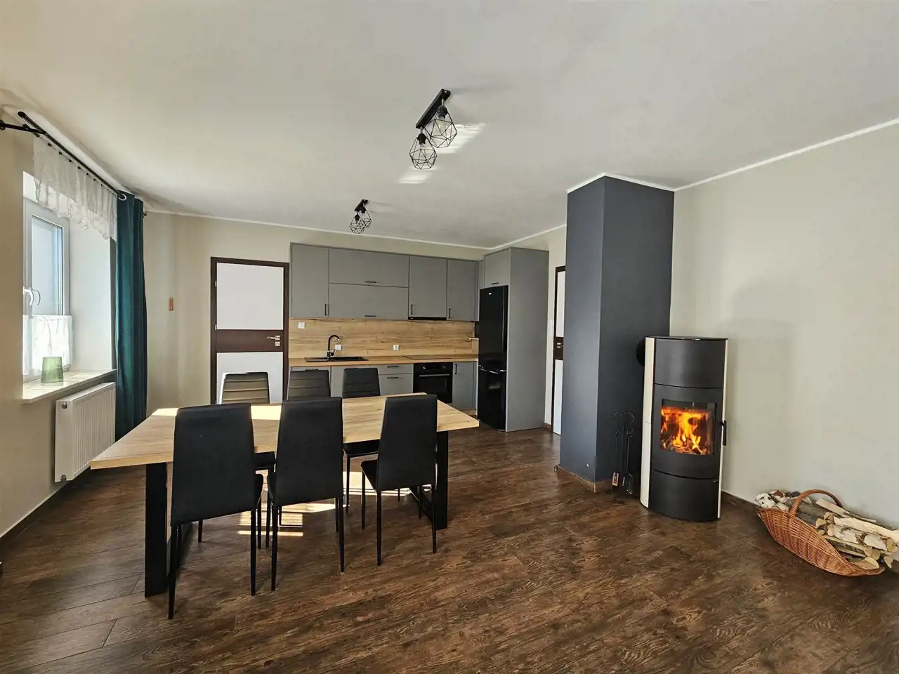 - wyposażenie: zabudowa kuchenna, stół z krzesłami, zmywarka, płyta indukcyjna, okap, piekarnik, lodówka