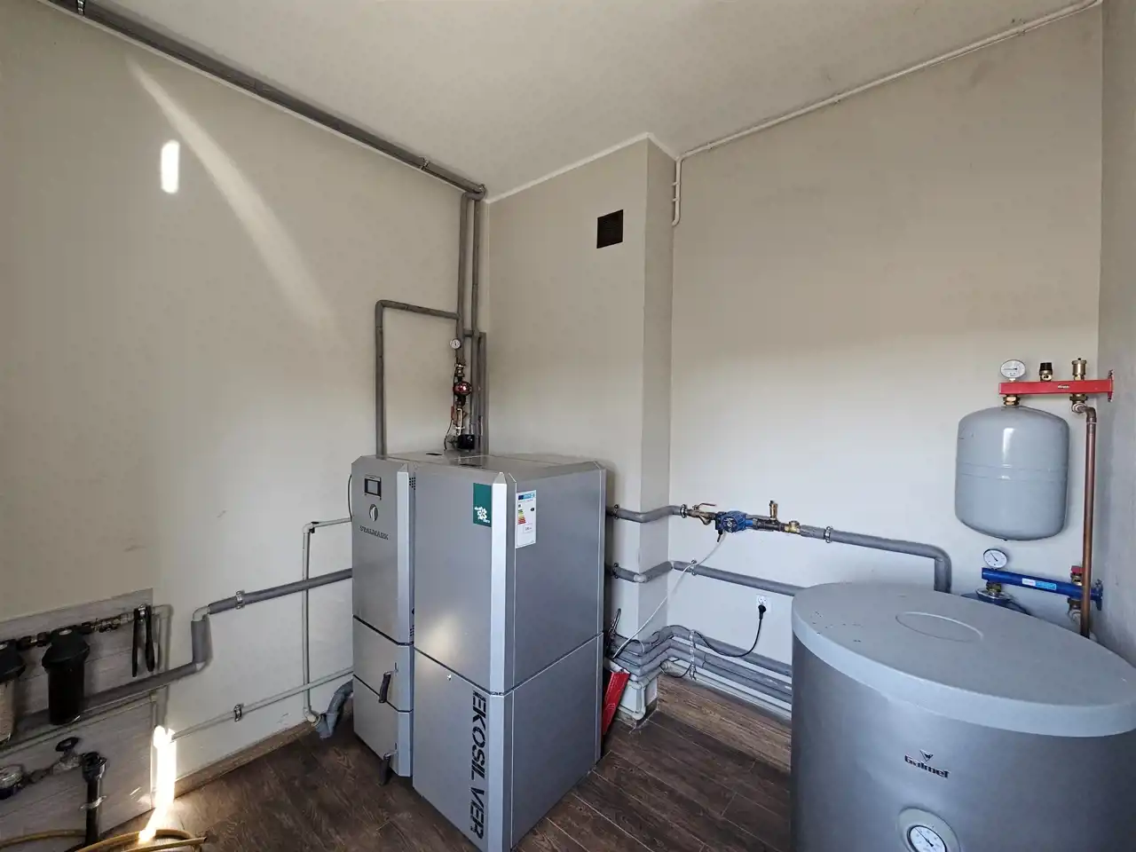 Na parterze znajduje się przestronny salon z aneksem kuchennym, wyposażony w nowoczesne urządzenia, takie jak lodówka, zmywarka, płyta indukcyjna, okap i piekarnik elektryczny. W salonie znajduje się również wolnostojący kominek, który dodaje uroku wnętrzu. Dodatkowo na parterze znajduje się łazienka oraz pomieszczenie gospodarcze z kotłownią. Na górze znajdują się trzy sypialnie, pokój przejściowy i dwie łazienki z prysznicem. Wnętrze charakteryzuje się przytulną atmosferą, naturalnym światłem.