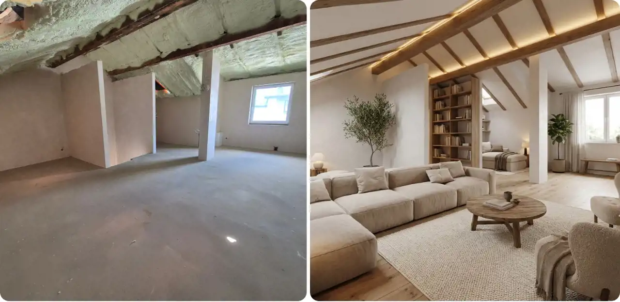 - Otwarta przestrzeń z oknami dachowymi oraz klasycznymi - 40 m2 - ocieplona i z rozprowadzeniem wszystkich instalacji wodno-kanalizacyjnych