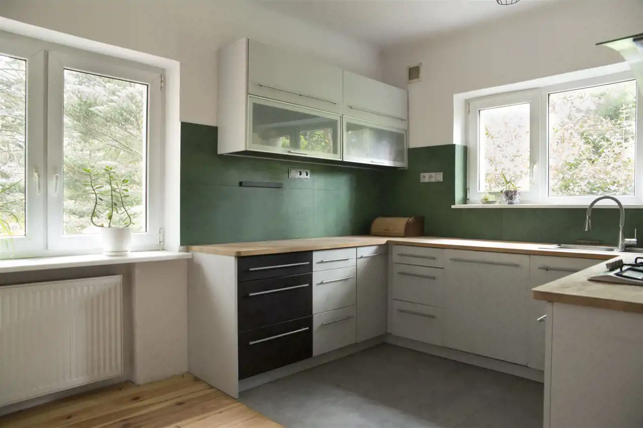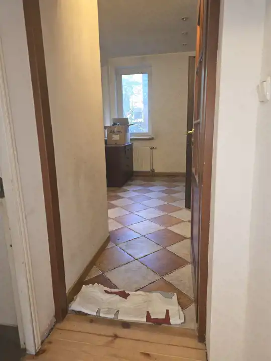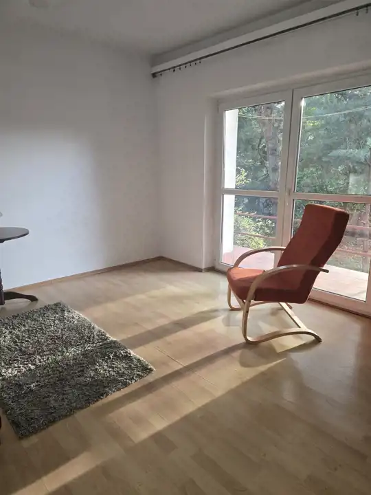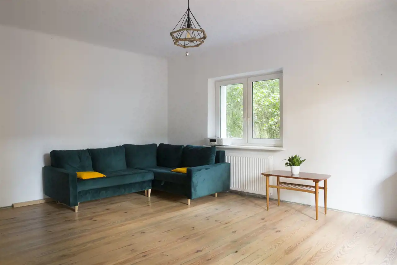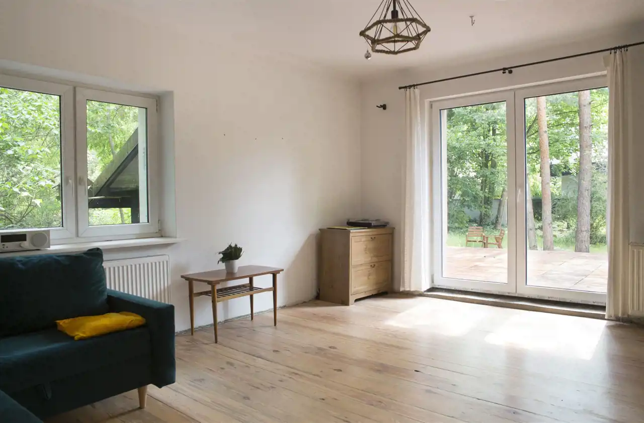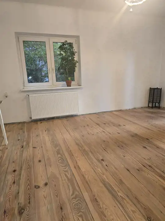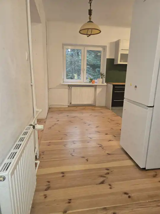 przedpokój - na podłodze terakota, ściany malowane na biało, pokój- na podłodze deski drewniane, ściany malowane na biało, wc - glazura, terakota, kuchnia z dużym oknem w pełni umeblowana, na podłodze gres częściowo otwarta na duży , jasny salon - na podłodze deski drewniane, ściany malowane na biało. Z salonu wyjście na taras z widokiem na ogród.