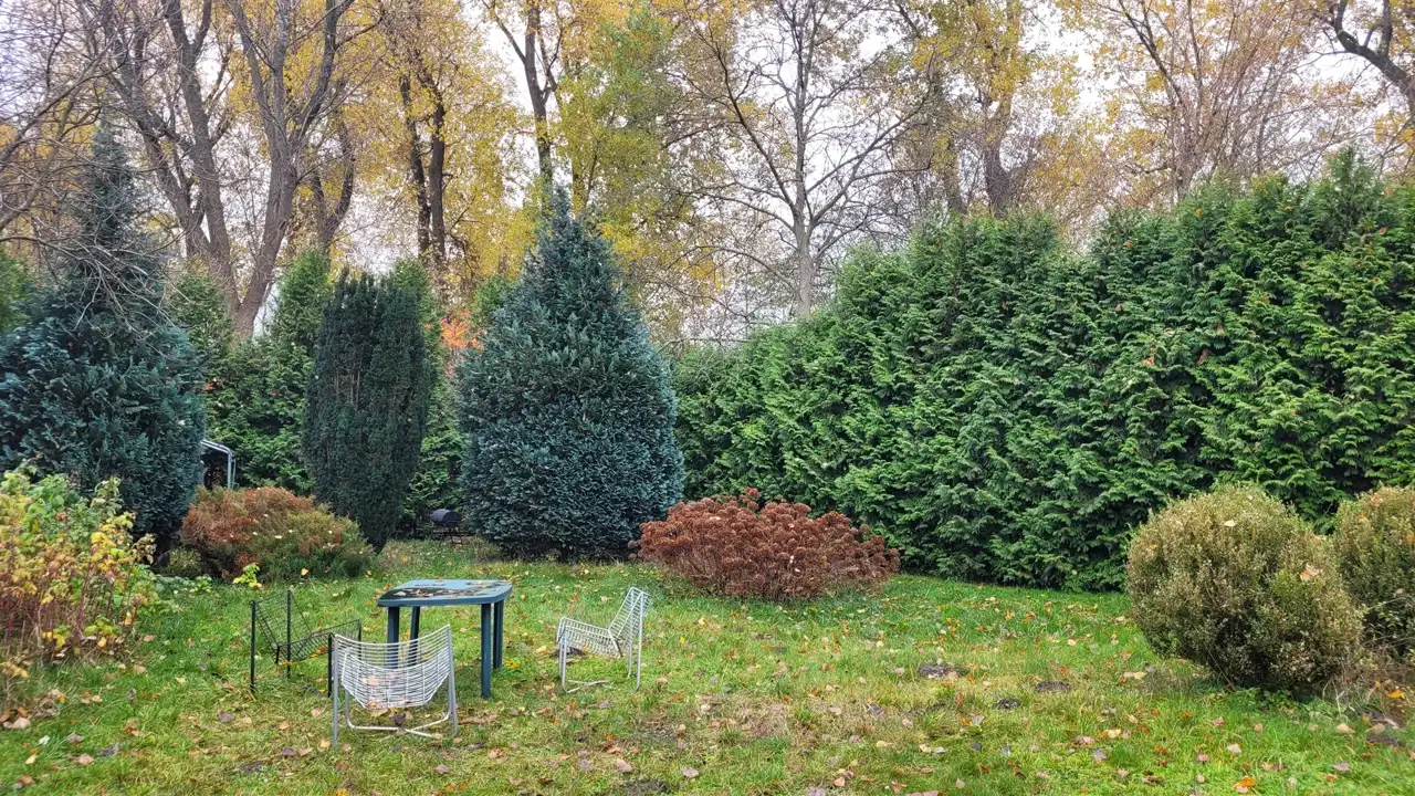 Wokół liczne nasadzenia, w tym wysokie tuje zapewniające prywatność,