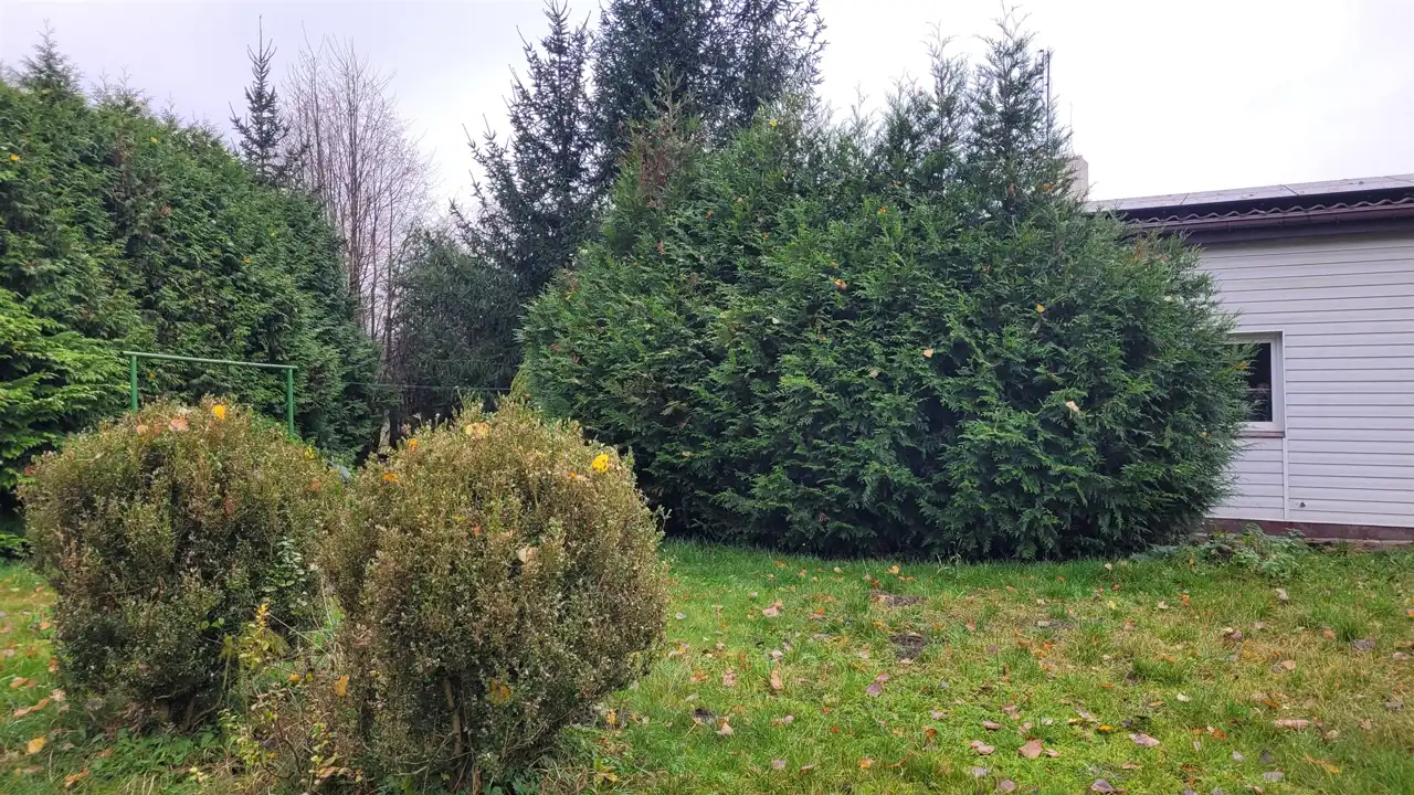 Nieruchomość znajduje się na dużej, ładnej działce o powierzchni 869 m², w kształcie prostokąta. Teren jest zielony, obsadzony tujami, które zapewniają prywatność oraz przyjemny klimat do wypoczynku.