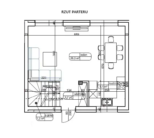PARTER: salon (26,3 m2) z aneksem kuchennym (5,1 m2), wiatrołap (3,7 m2), pom. gospodarcze (1,3 m2).