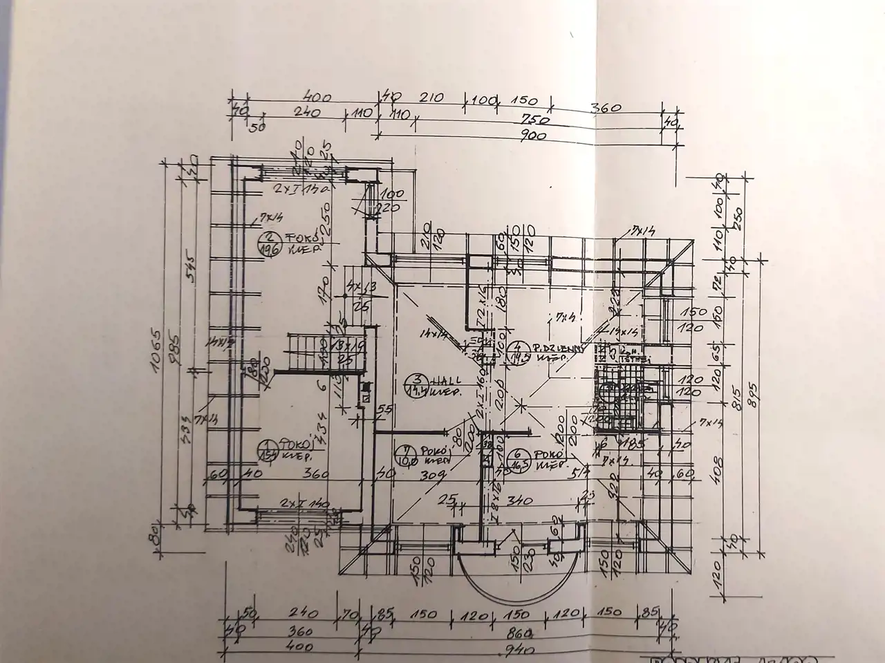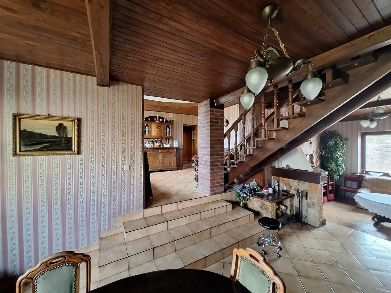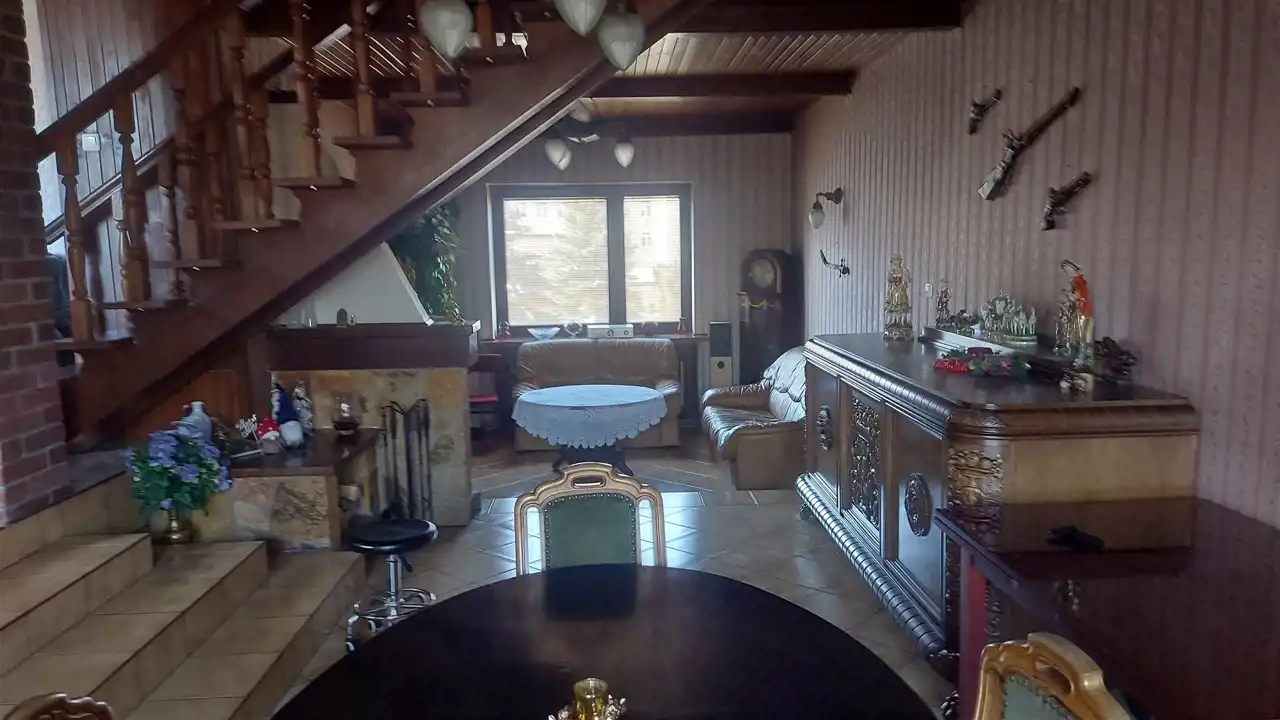 9 pokoi ok. 206 m2. Wybudowany w dwóch etapach w 1975 r i rozbudowa w 1994 r. Garaże w budynku - na 3 samochody.