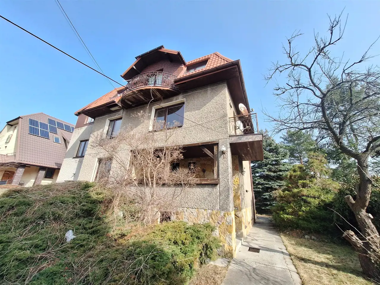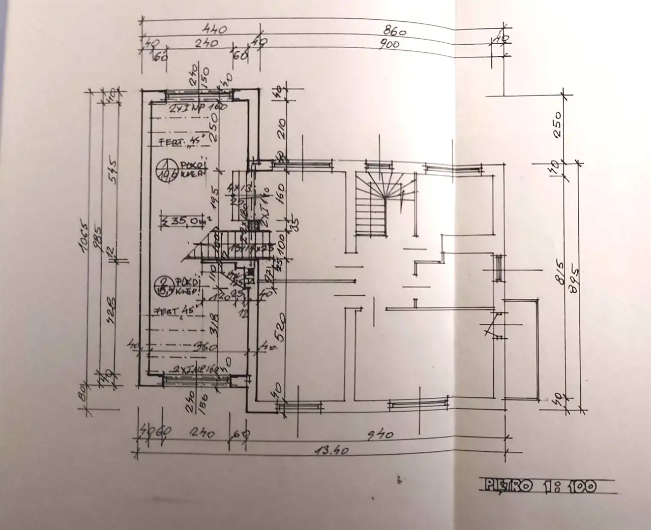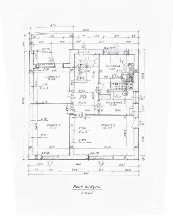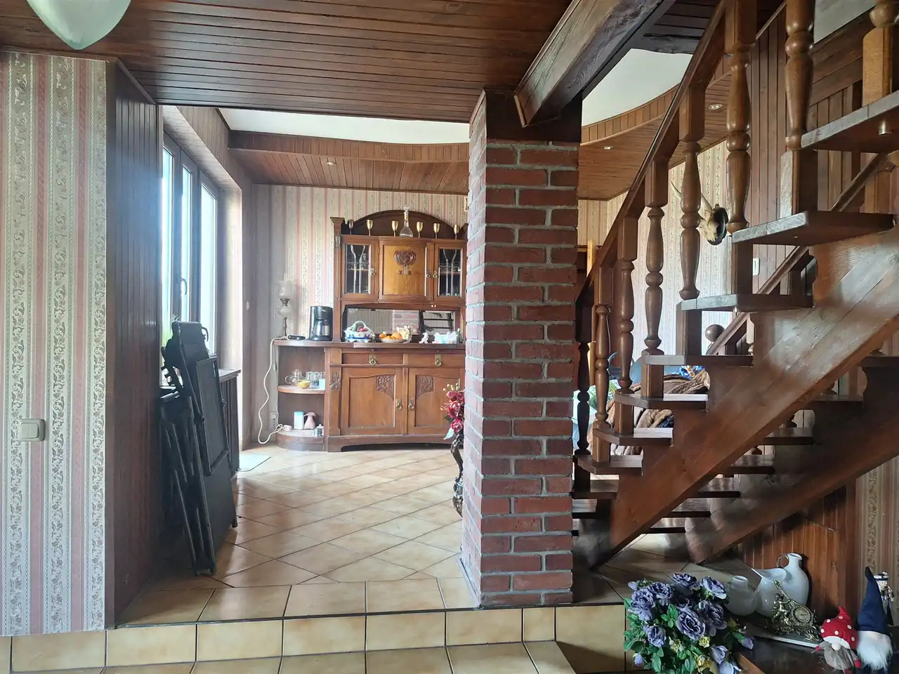 9 pokoi ok. 206 m2. Wybudowany w dwóch etapach w 1975 r i rozbudowa w 1994 r. Garaże w budynku - na 3 samochody.