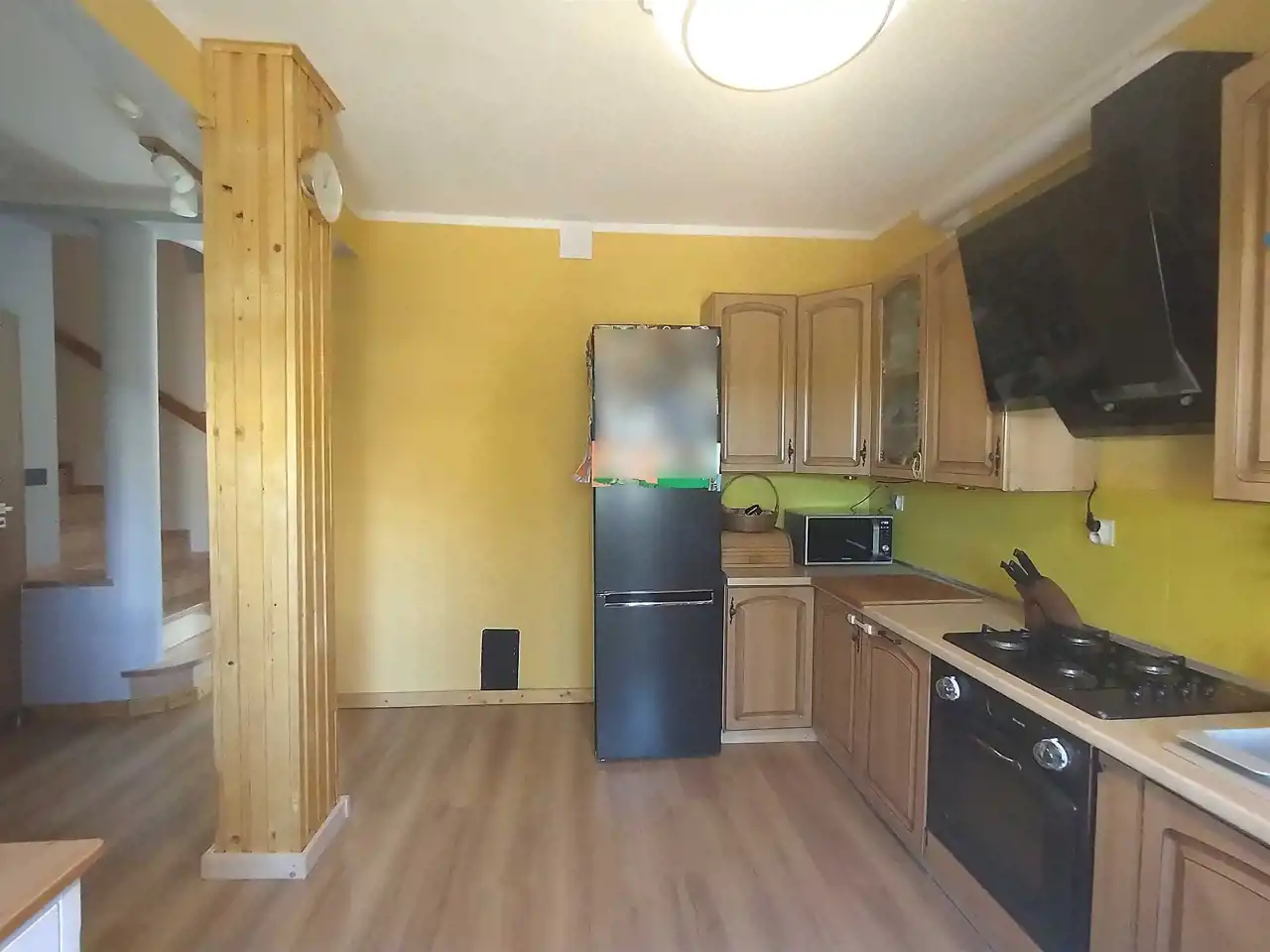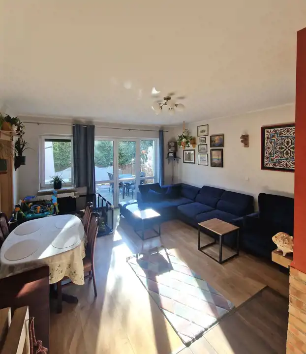 Na parterze znajdują się pokój dzienny o powierzchni ponad 24,m2, z kominkiem, z wyjściem na taras, pokój ok. 12 m2, kuchnia ok. 11 m2 (wyposażona w chłodziarko-zamrażarkę, kuchenkę gazowo-elektryczną, piekarnik elektryczny), łazienka z toaletą i natryskiem, korytarz oraz wiatrołap. Z wiatrołapu jest przejście do garażu. Kuchnia jest przestronna, doświetlona dużą ilością światła dziennego i częściowo otwarta na korytarz.