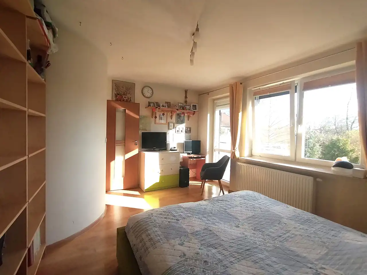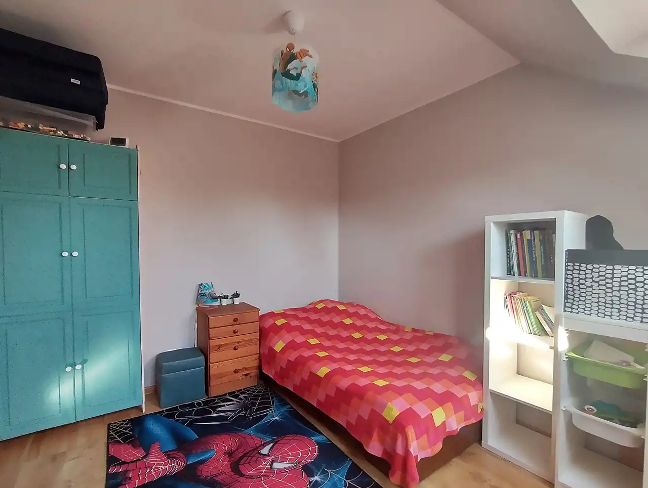 Na drugą kondygnację prowadzą schody z litego drewna. Na piętrze są 3 sypialnie, w tym jedna (ok. 18 m2) z balkonem i garderobą 3,85 m2, druga ok. 15,5 m2 i trzecia z oknami połaciowymi (ok. 9 m2 po podłodze) oraz duża, widna łazienka ok.11 m2. Wnętrza są słoneczne, większość pomieszczeń ma okna od strony południowej.